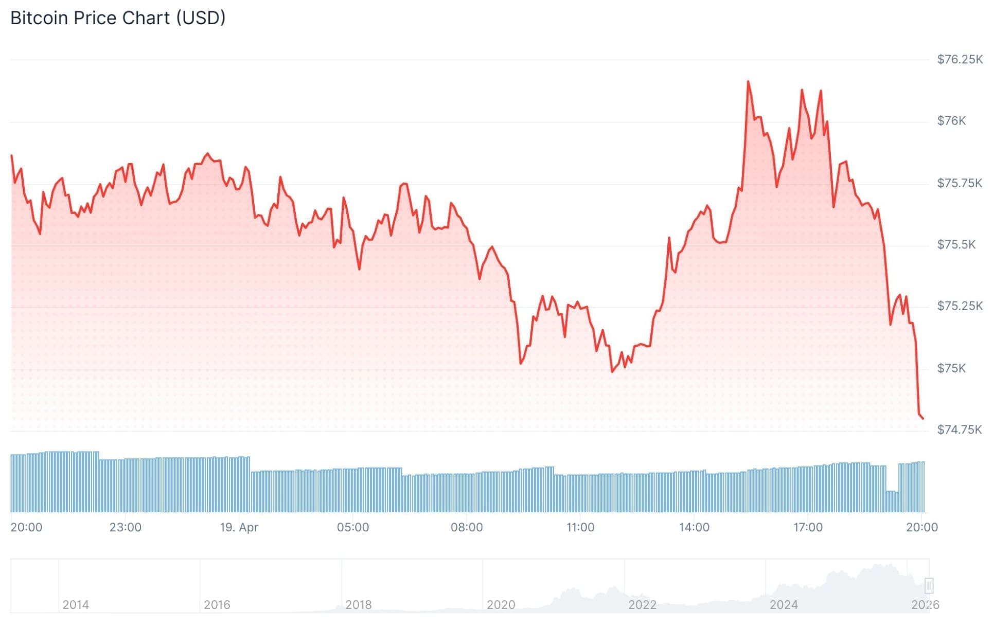 El viernes al caer la noche, Bitcoin alcanzó un pico de 78,300 dólares, pero actualmente su valor es un 4 por ciento menor. Ahora se paga algo menos de 75,000 dólares por la mayor criptomoneda.