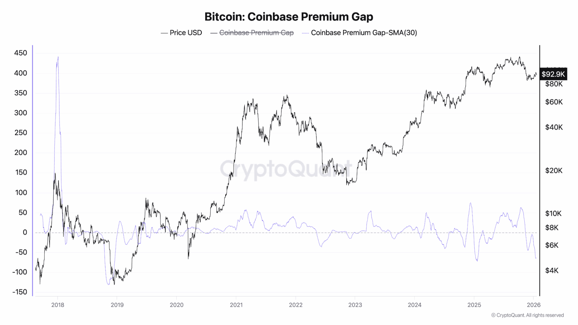 Un indicador clave es la llamada Brecha Premium de Coinbase. Este mide la diferencia de precio entre Bitcoin en Coinbase y en Binance. Cuando Bitcoin se vuelve más barato en Coinbase, generalmente indica una presión de venta adicional por parte de los comerciantes estadounidenses.