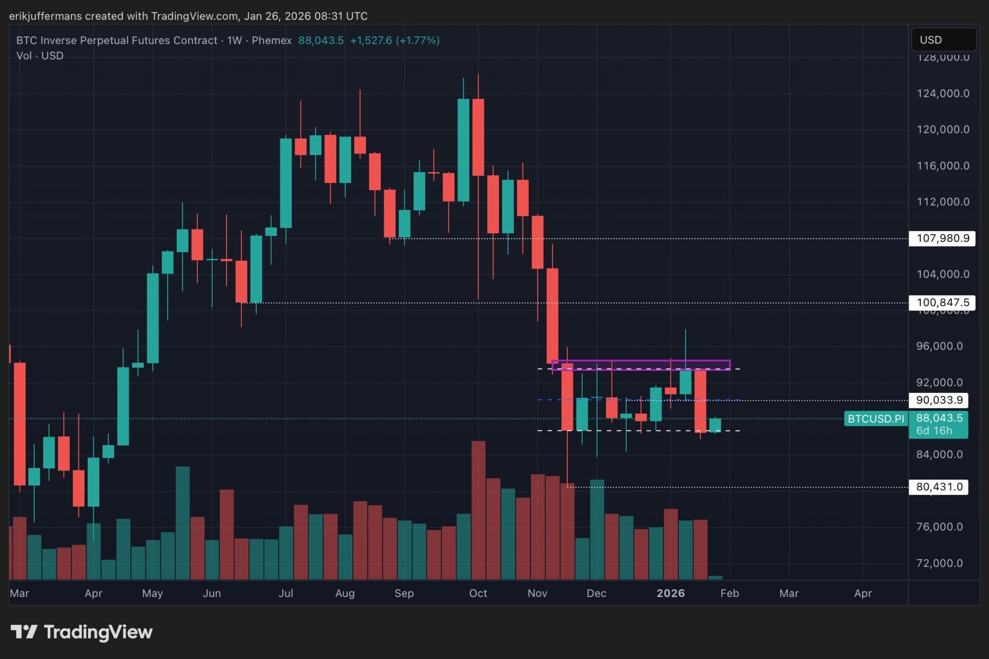 Los alcistas quieren ver un ‘cambio’ de la resistencia en 90,000 dólares. En ese caso, podríamos apuntar hacia la parte superior del rango, alrededor de 93,500 dólares. Hacia la zona de resistencia púrpura con la que el precio ha lidiado durante meses.