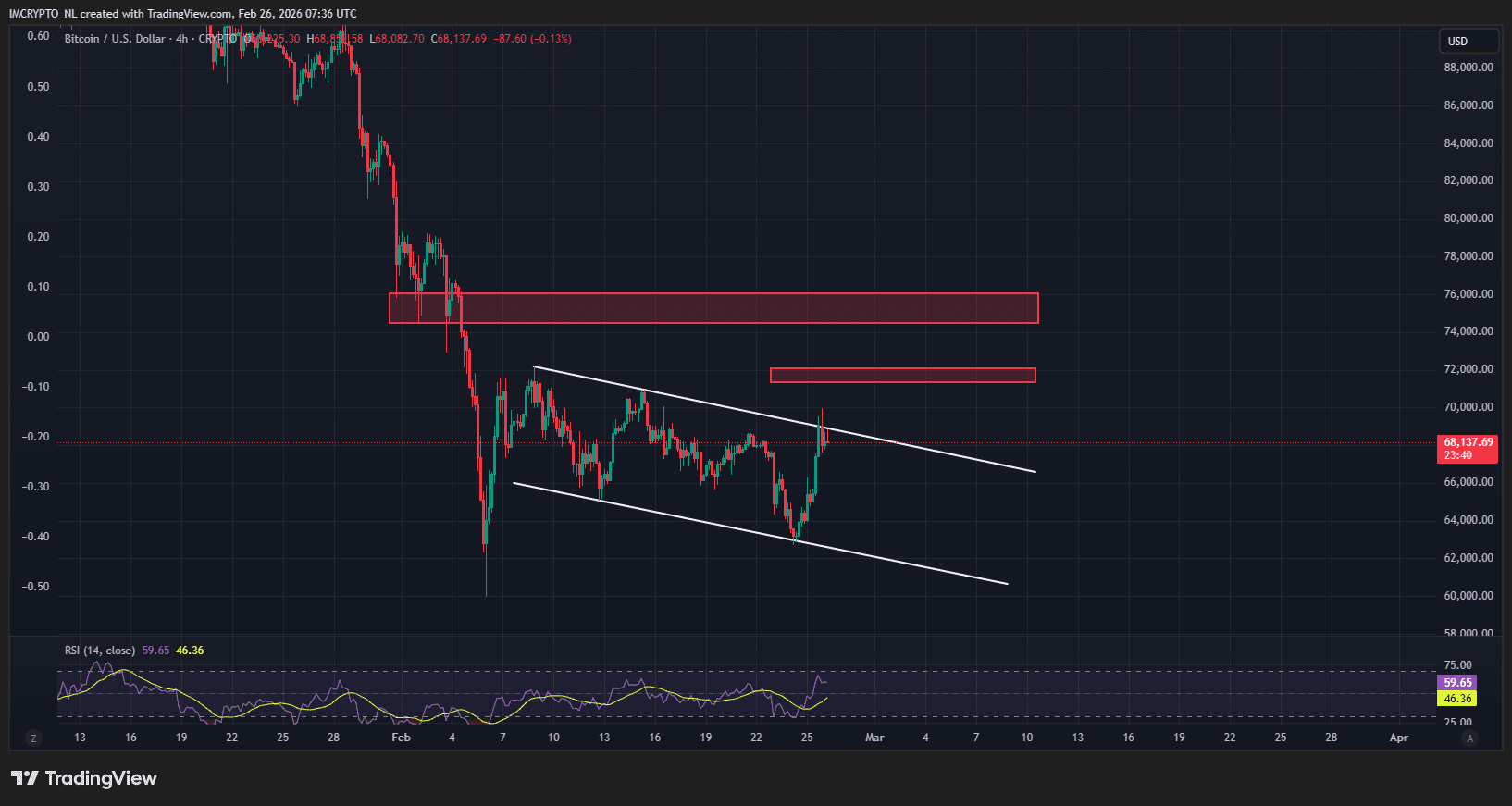 Sería positivo si Bitcoin logra pronto romper al alza. Este sábado es el último día del mes, y un cierre por encima de los 74,600 dólares sería muy alentador. Ese fue el punto más bajo en abril del año pasado, cuando el mercado estaba en llamas debido a la guerra comercial de Donald Trump.