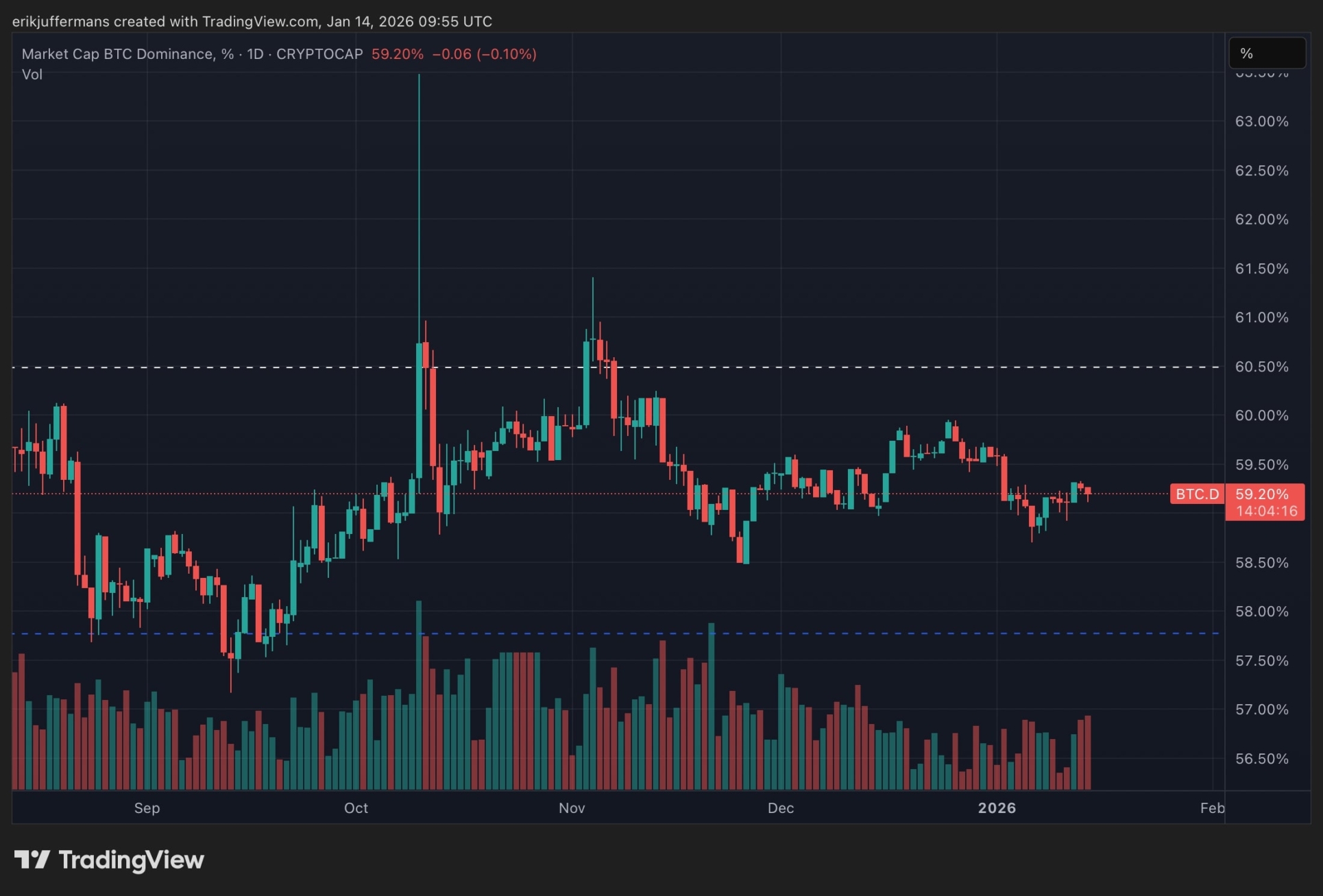 Ahora revisamos rápidamente la dominancia de BTC. Este gráfico muestra la participación de BTC en el mercado de criptomonedas en general. Vemos que la BTC.D está ligeramente en rojo. A pesar del notable aumento de Bitcoin, las altcoins están ganando algo de terreno frente a BTC.