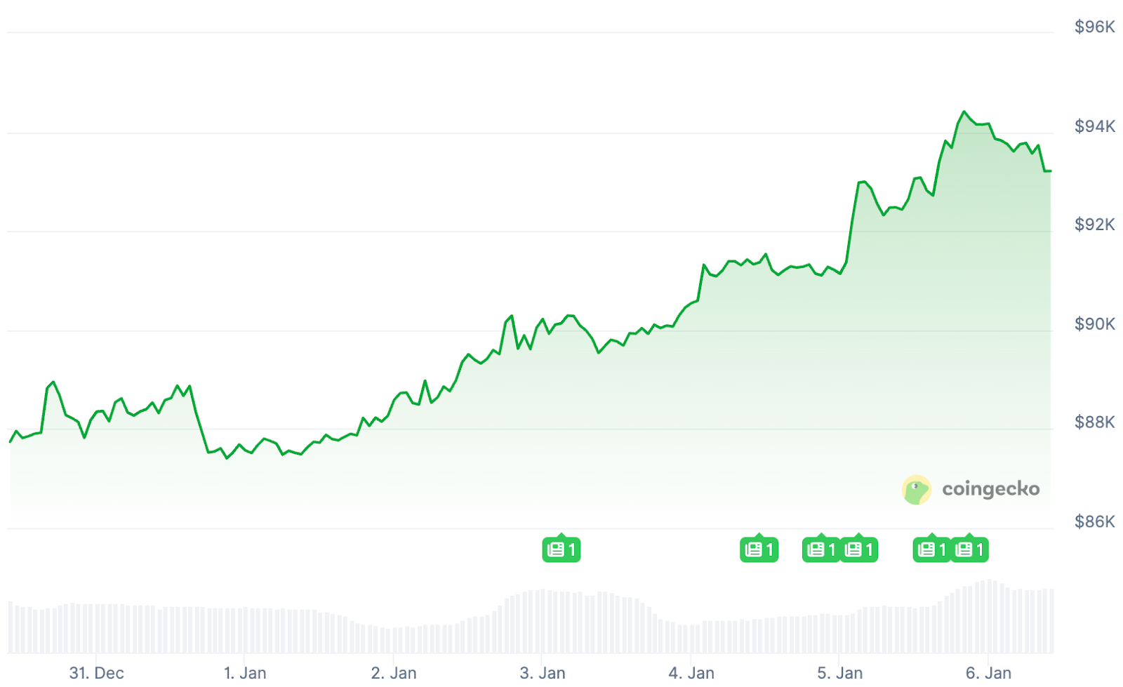 El precio de Bitcoin se sitúa actualmente un 6,5% por encima de su nivel a principios de año, alcanzando los 93.500 dólares. Ayer por la noche, se registró un pico de 94.750 dólares, el nivel más alto desde el 17 de noviembre.