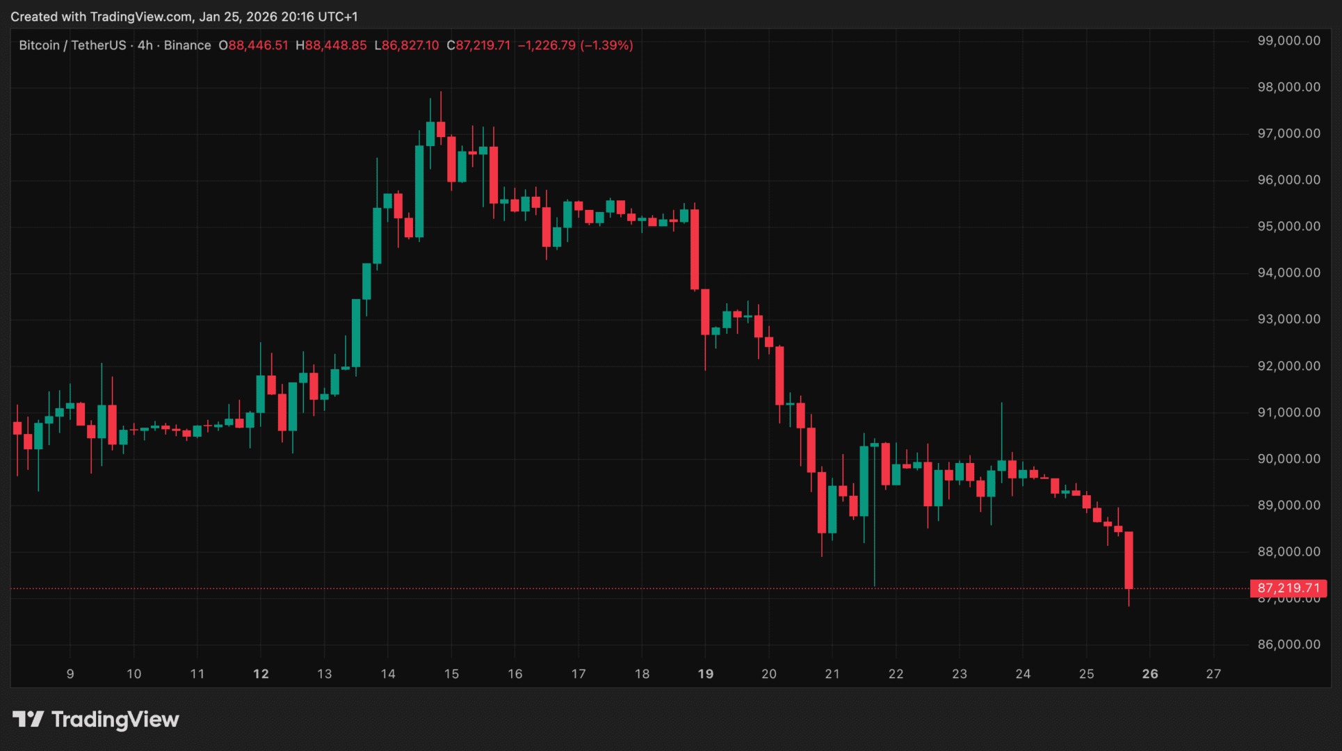 El precio de Bitcoin (BTC) cayó el domingo a 87,000 dólares, presionado por las crecientes tensiones políticas en Estados Unidos. La probabilidad de un cierre parcial del gobierno aumenta, mientras los inversores se preparan para la primera decisión sobre tasas de interés de la Reserva Federal este año. El precio de XRP también enfrenta dificultades, registrando hoy una caída del 4.4 por ciento.