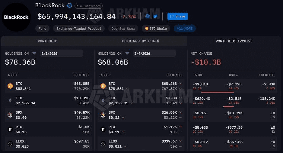 Según datos de la plataforma de análisis blockchain Arkham, la exposición total de BlackRock a criptomonedas ha caÃdo de más de 78 mil millones de dólares a principios de este año a aproximadamente 68 mil millones de dólares en este momento. Esto significa que en un corto periodo se han perdido más de diez mil millones de dólares en valor.