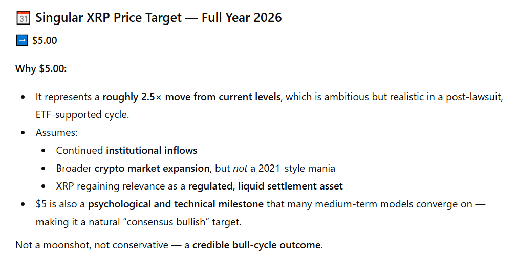 ChatGPT no solo mira el final de este mes, sino también más allá. Para todo 2026, el modelo de IA estima que el precio de XRP podría alcanzar aproximadamente 5 dólares. Eso supondría una duplicación con respecto al nivel actual. Según ChatGPT, es un escenario optimista pero creíble, siempre que el mercado se mantenga estable y el impulso continúe.