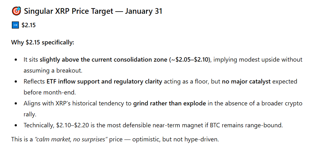 ChatGPT considera que 2,15 dólares es un objetivo de precio creíble para XRP el 31 de enero. Según la IA, esto no es una estimación excesivamente optimista, pero tampoco conservadora. Más bien es un precio que sube de manera constante en lugar de explotar repentinamente.