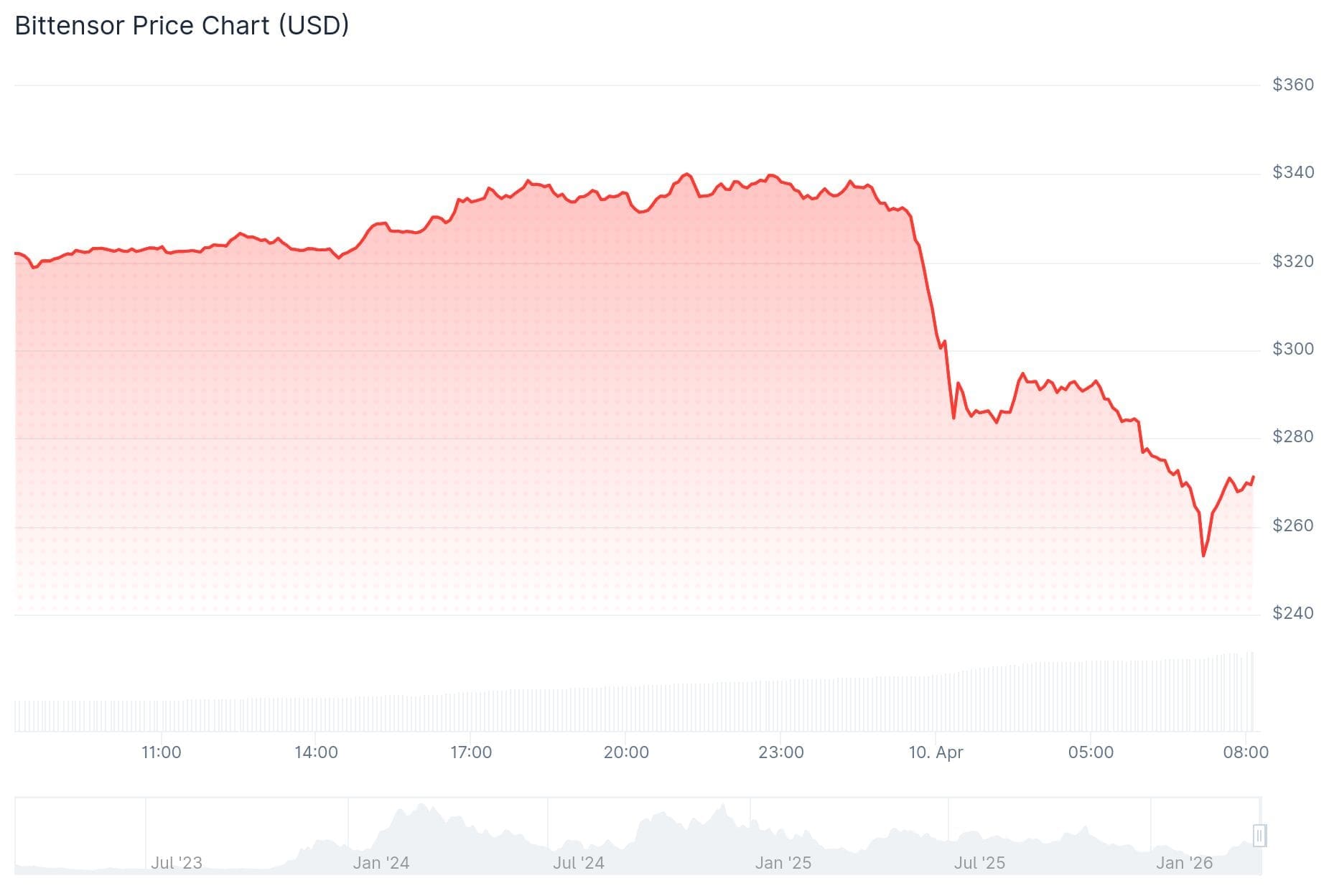 Bittensor, la 31ª criptomoneda más valiosa, es hoy la mayor perdedora del mercado. Su precio cayó anoche de 337 dólares a un mínimo de 254 dólares, una pérdida enorme de casi el 25% en menos de seis horas.