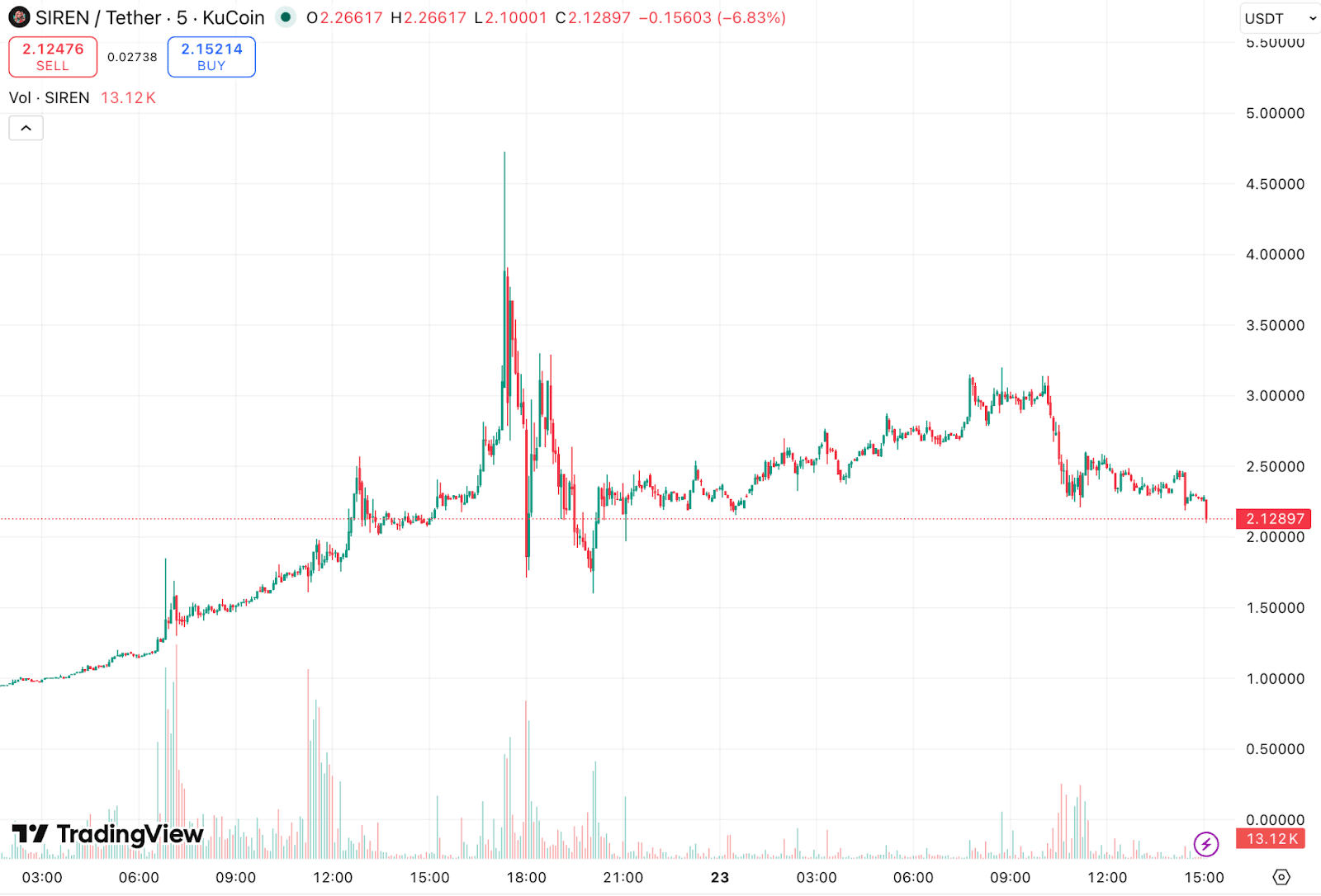 Ayer por la mañana, Siren se negociaba alrededor de 0,95 dólares. Más tarde, durante el día, el token alcanzó brevemente un nuevo máximo histórico de aproximadamente 4,72 dólares, lo que representa un impresionante aumento del 397 por ciento.