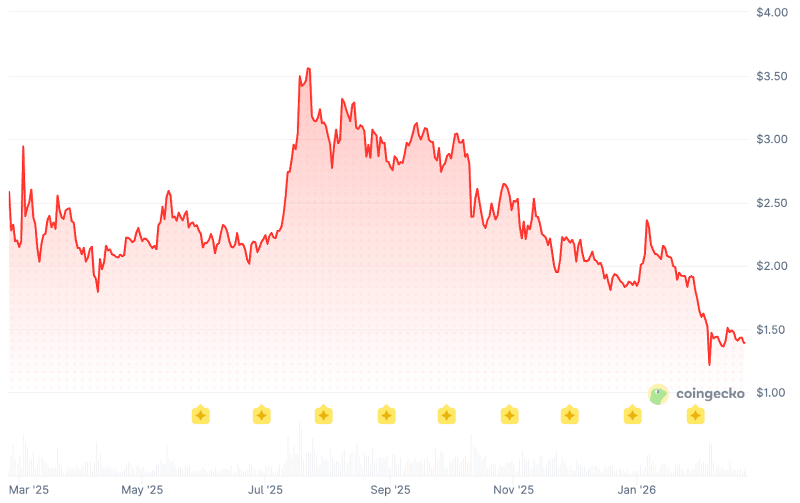 Tras un aumento explosivo hasta 3,65 dólares en julio del año pasado, el precio de XRP ha retrocedido a 1,39 dólares. Esto representa una caÃda de casi el 62 por ciento en menos de ocho meses. Enero fue particularmente duro, ya que la moneda llegó a un mÃnimo temporal de 1,11 dólares.
