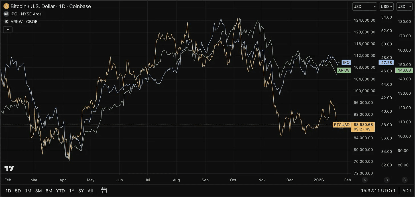 El ETF de IPO ofrece exposición a empresas que recientemente han salido a bolsa, mientras que ARKW se centra en empresas tecnológicas en fases tempranas de desarrollo. Son, por tanto, ETF altamente especulativos. Lo notable es que alcanzaron un pico provisional junto a Bitcoin en octubre.