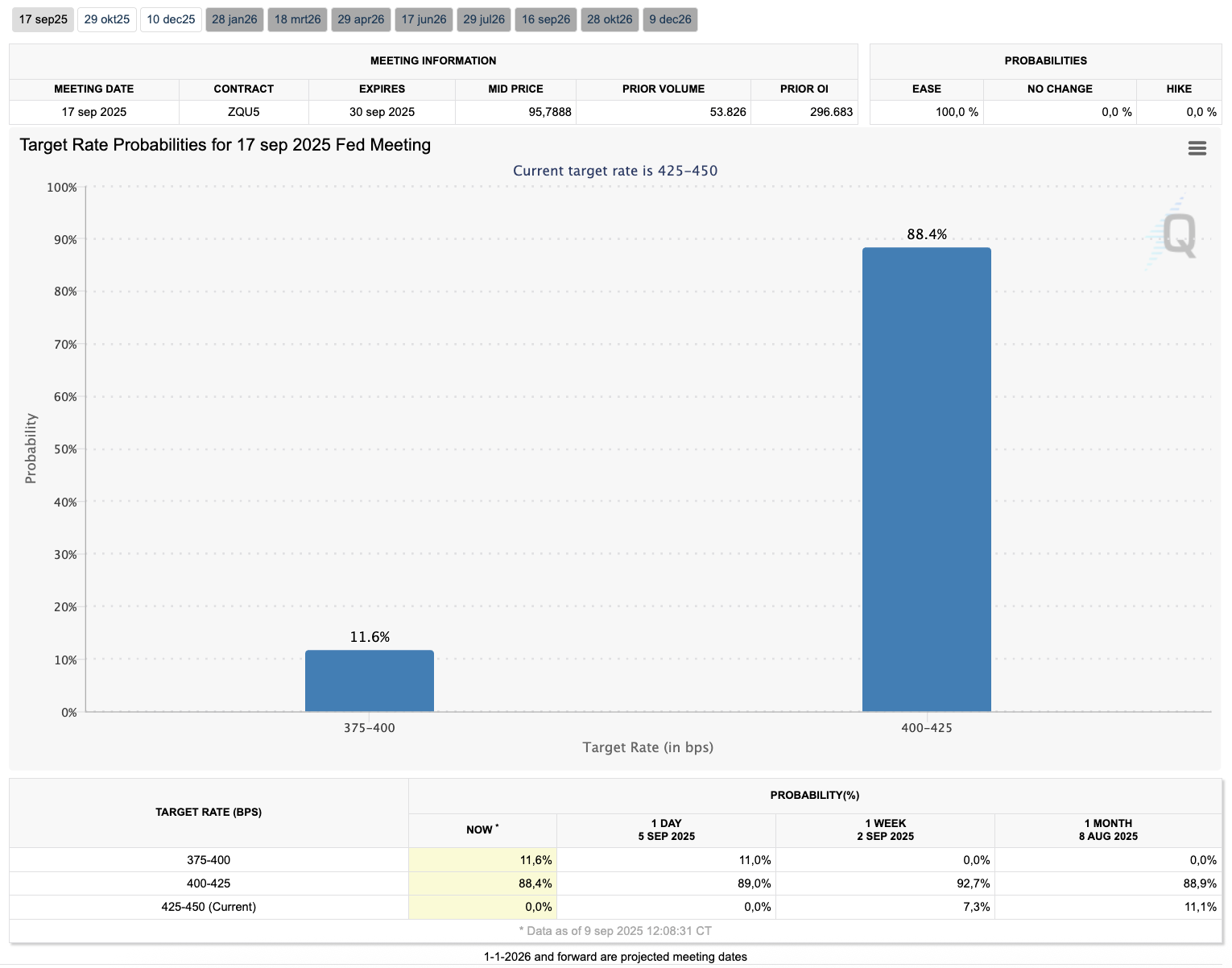 Mientras tanto, las cifras de la herramienta CME FedWatch muestran que el 88.4 por ciento del mercado cuenta con una reducción de la tasa de interés de 25 puntos básicos este mes. Solo el 11.6 por ciento espera una reducción de 50 puntos básicos.
