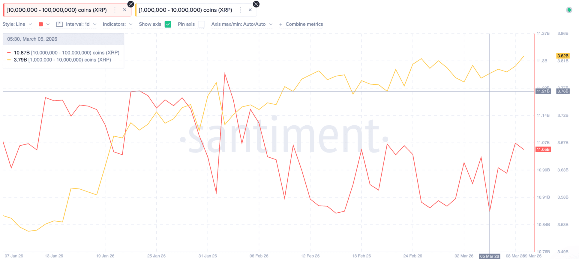 Mientras que los inversores más pequeños enfrentan pérdidas, los grandes inversores muestran un comportamiento diferente. Según datos de Santiment, las carteras con entre 1 y 10 millones de XRP han ampliado su posición desde principios de marzo. Su posesión conjunta aumentó de 3,79 mil millones a 3,82 mil millones de XRP, una compra de aproximadamente 30 millones de tokens.