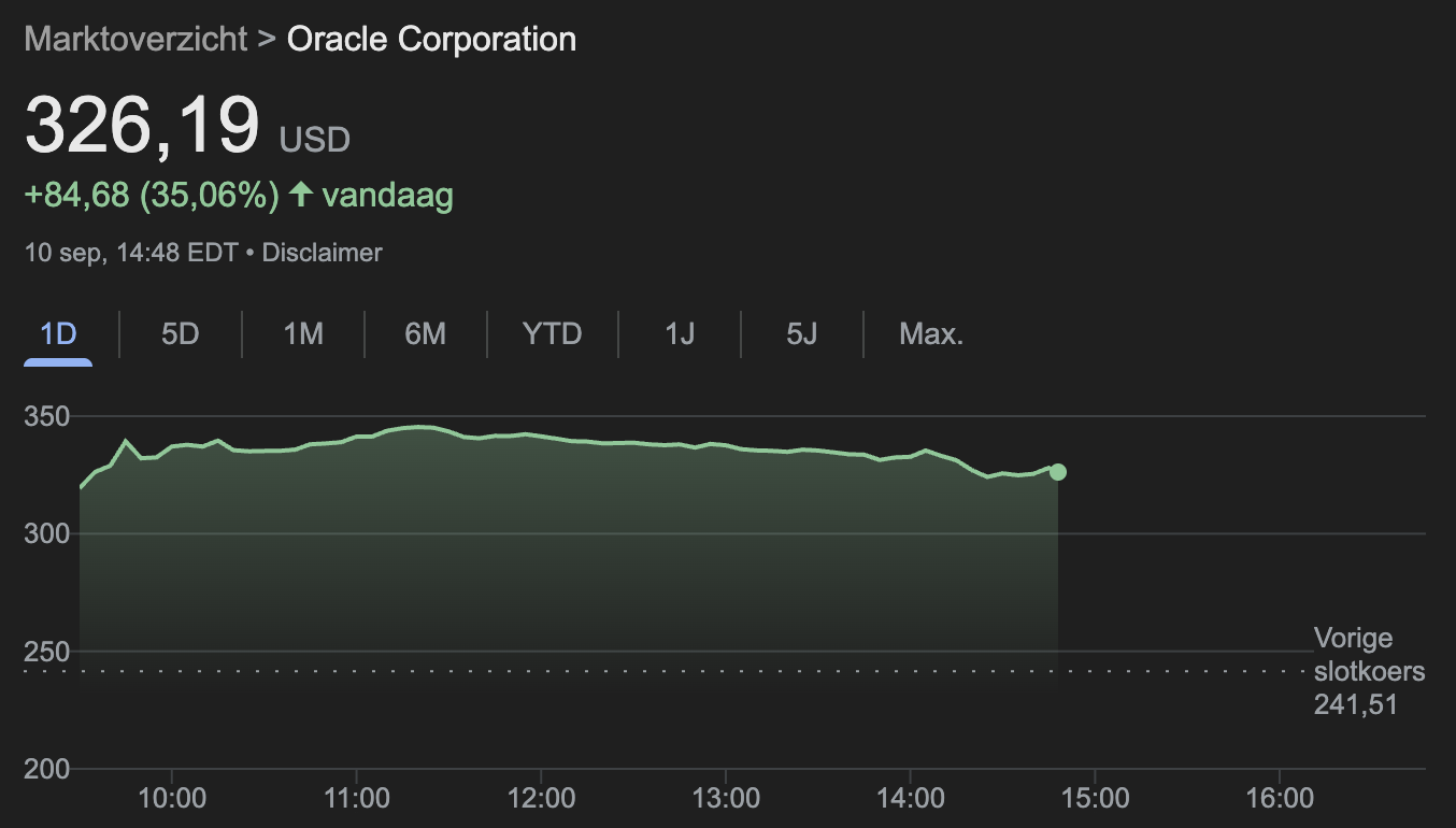 La acción de Oracle tuvo un comienzo tumultuoso en el día de negociación. En cuestión de minutos, se alcanzó un nuevo máximo histórico: 345,49 dólares. Para comparar: el récord anterior de julio estaba aún por debajo de los 260 dólares. Después de una ligera caída, la acción cerró aún con una ganancia de más del 35 por ciento.