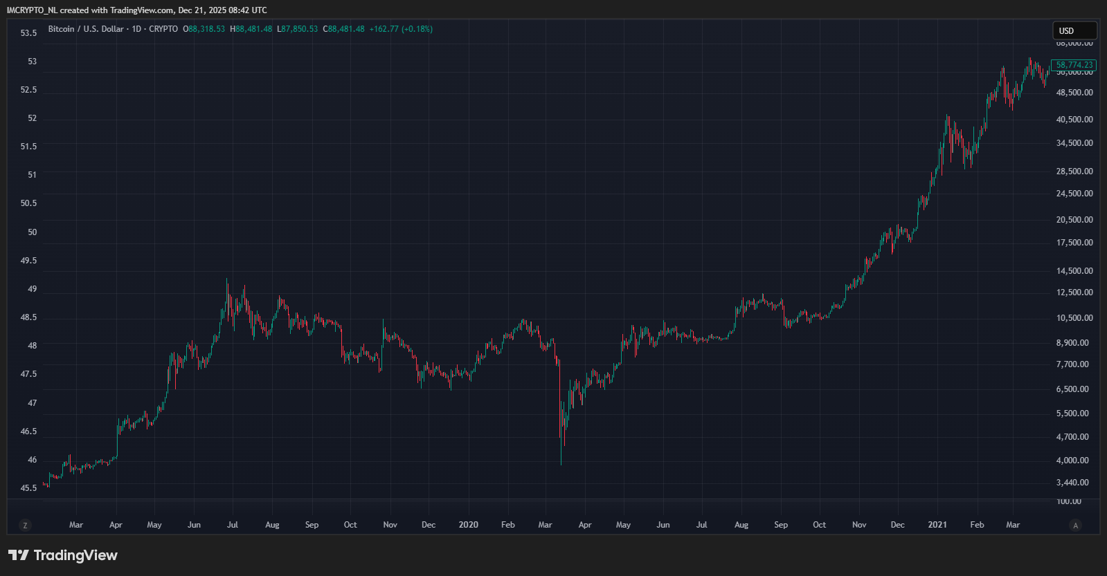 En marzo de 2020, el panorama era completamente distinto. Fue entonces cuando quedó claro que el coronavirus se convertiría en una pandemia mundial. Los gobiernos anunciaron confinamientos masivos, y la creciente incertidumbre provocó un colapso generalizado en los mercados financieros. Bitcoin no fue la excepción.