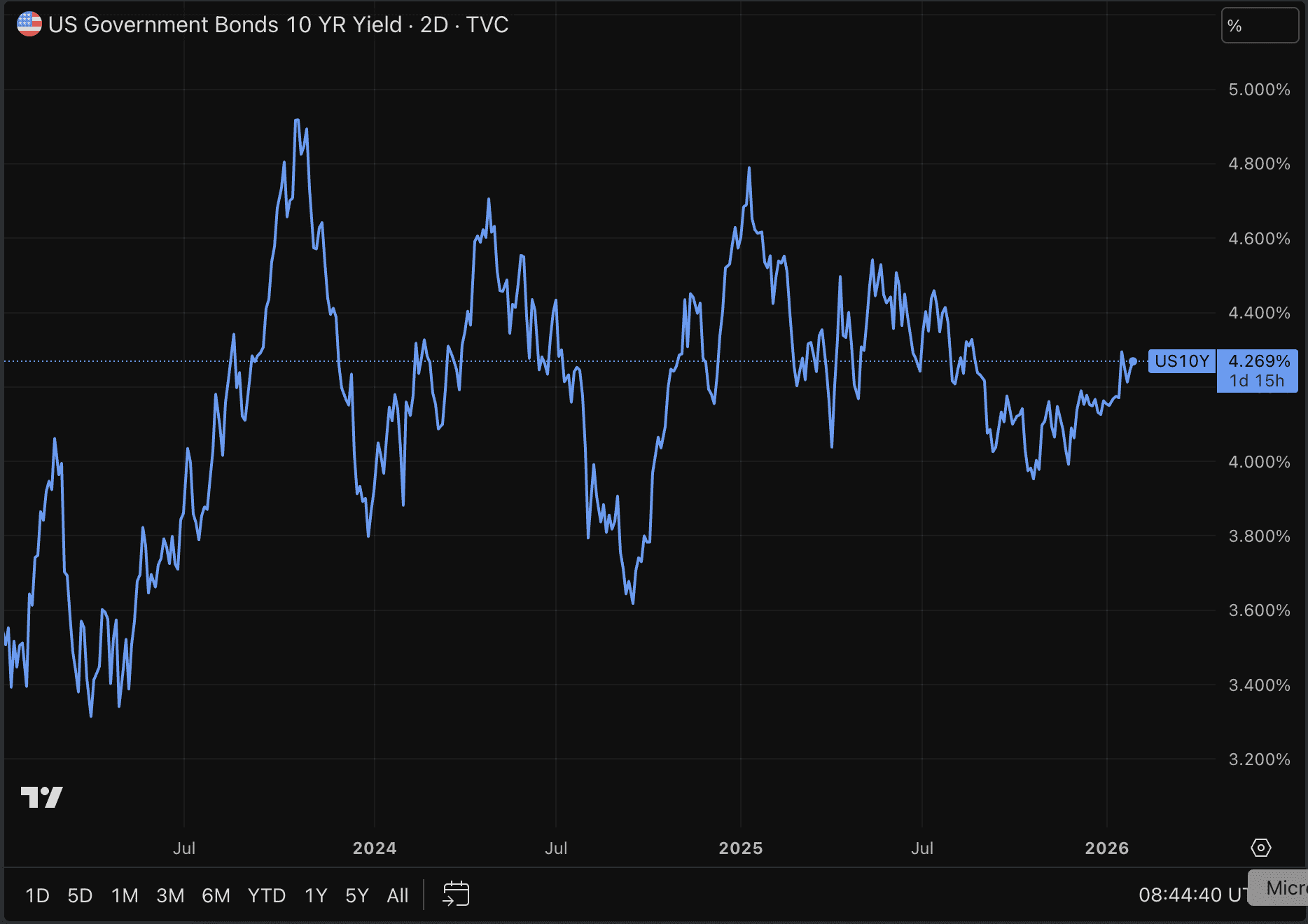 Si esta explosión de precios marcara realmente el inicio del fin del dólar estadounidense, eso también se reflejaría en el mercado de bonos. En tal escenario, los inversionistas exigirían tasas de interés más altas en los bonos del Tesoro de EE. UU. como compensación por la disminución de la confianza en el poder adquisitivo del dólar.