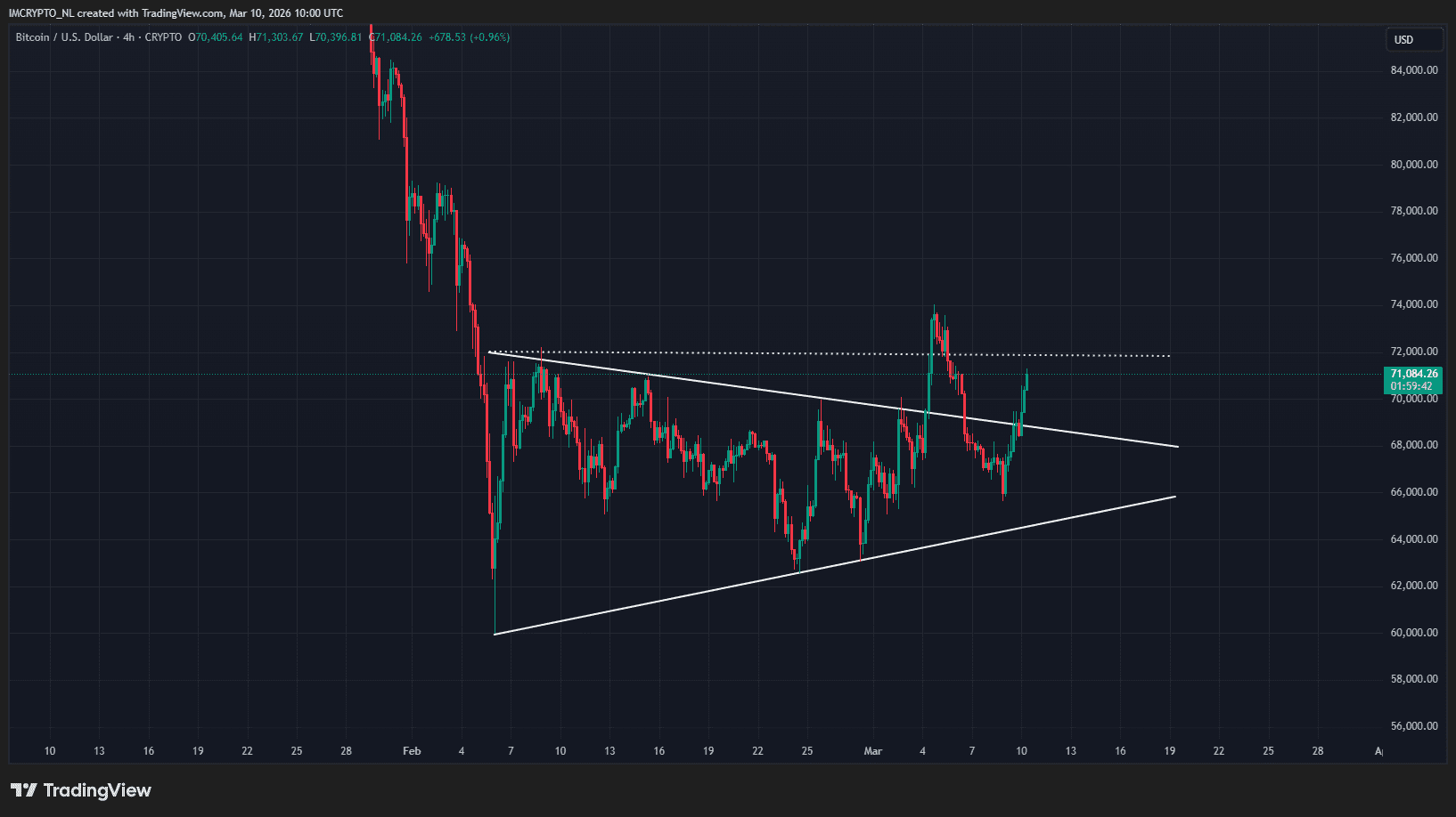 En el gráfico de cuatro horas, Bitcoin ha roto una llamada triángulo simétrico, caracterizado por máximos más bajos (línea de resistencia descendente) y mínimos más altos (línea de soporte ascendente).