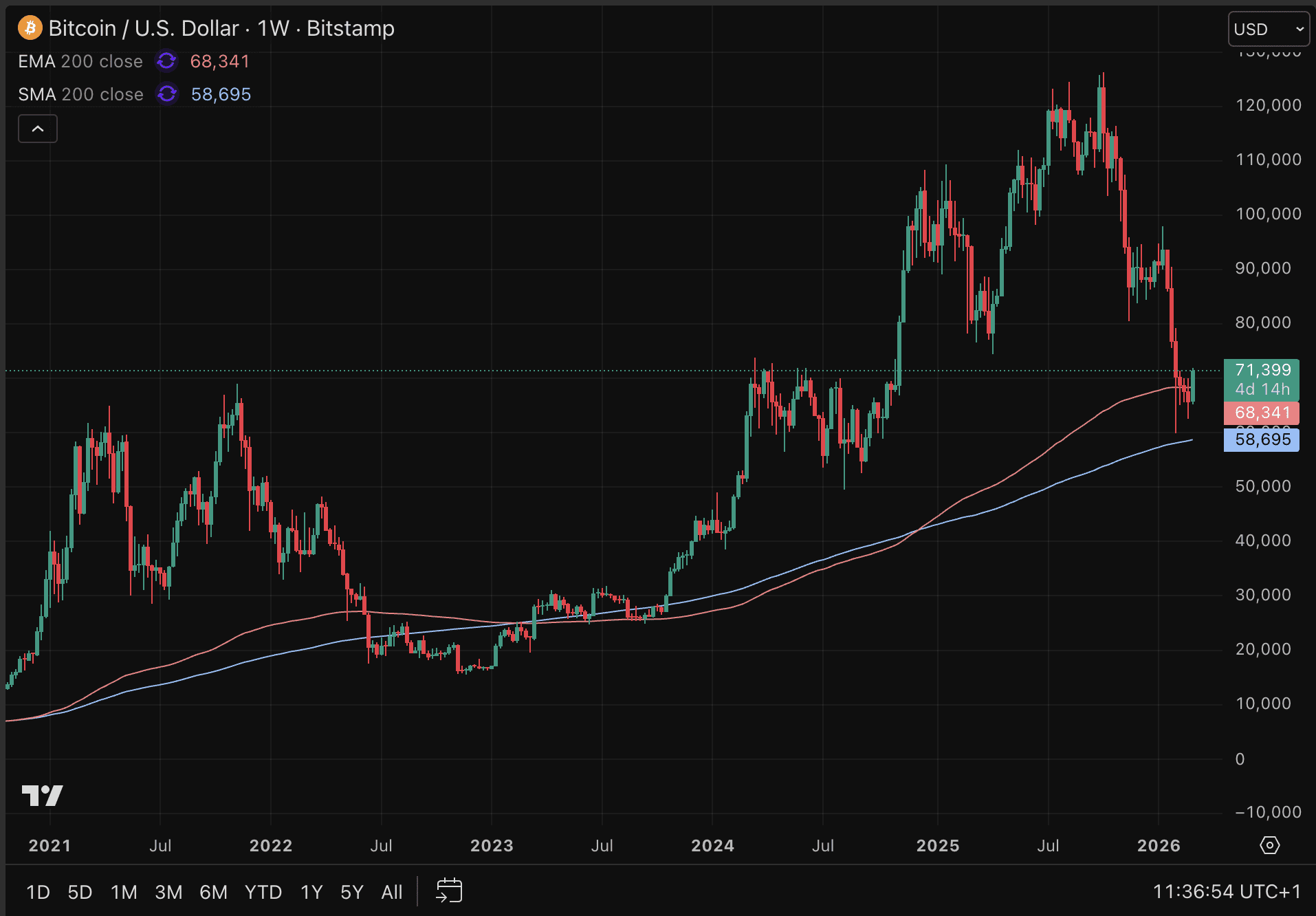 Con el aumento a 71.000 dólares, Bitcoin ha superado varias resistencias importantes. Entre ellas, el máximo histórico de 2021 de 69.000 dólares y el promedio móvil exponencial de 200 semanas del precio de Bitcoin (EMA) en 68.341 dólares.