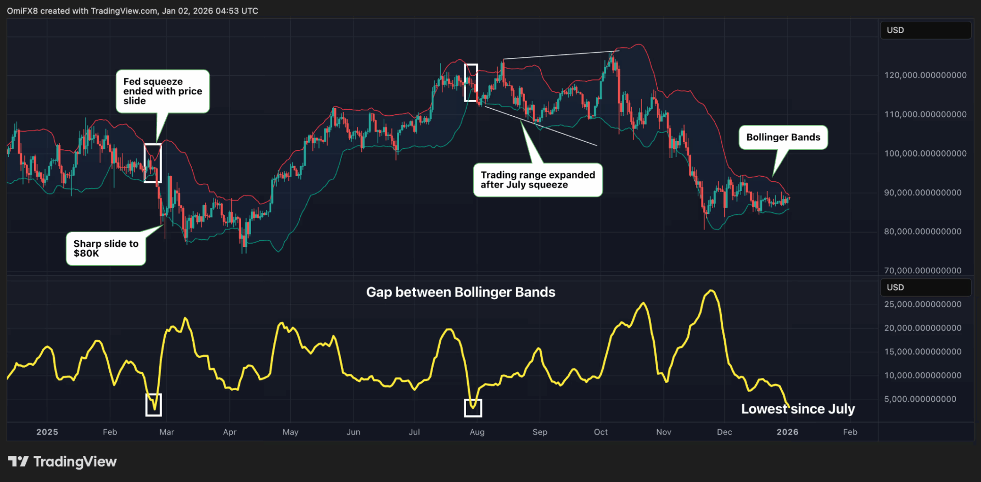 El precio de Bitcoin ha oscilado entre 85.000 y 90.000 dólares durante dos semanas. Esto sugiere que el mercado está equilibrado, pero la tensión está aumentando bajo la superficie. Esto se refleja en las Bandas de Bollinger, un indicador muy utilizado para medir la volatilidad.