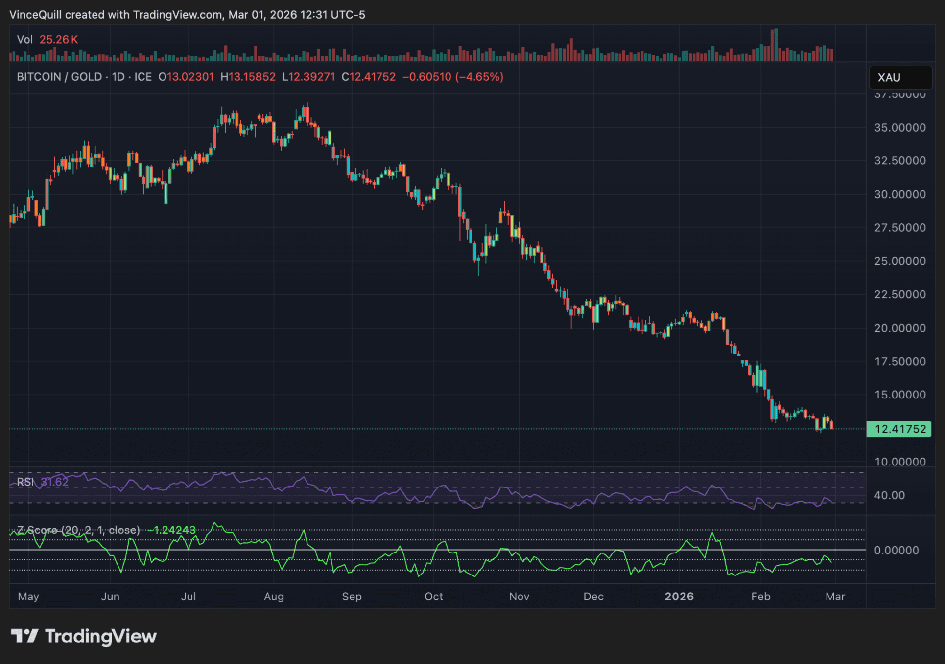 Se refiere a la llamada Z-score de la relación entre Bitcoin y el oro. Esta mide qué tan lejos está la relación actual del promedio histórico. Un valor por debajo de cero significa que Bitcoin está relativamente bajo. Cuando la puntuación cae por debajo de menos 2, en el pasado han seguido importantes subidas de precio.