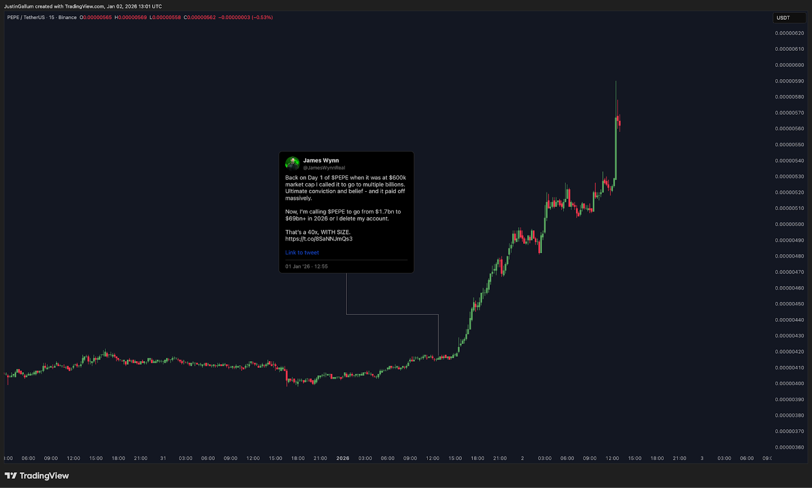 Un factor clave en este rally es una llamativa predicción del analista de criptomonedas James Wynn. A través de su canal en X, expresó que PEPE podría alcanzar una capitalización de mercado de 69 mil millones de dólares en 2026.