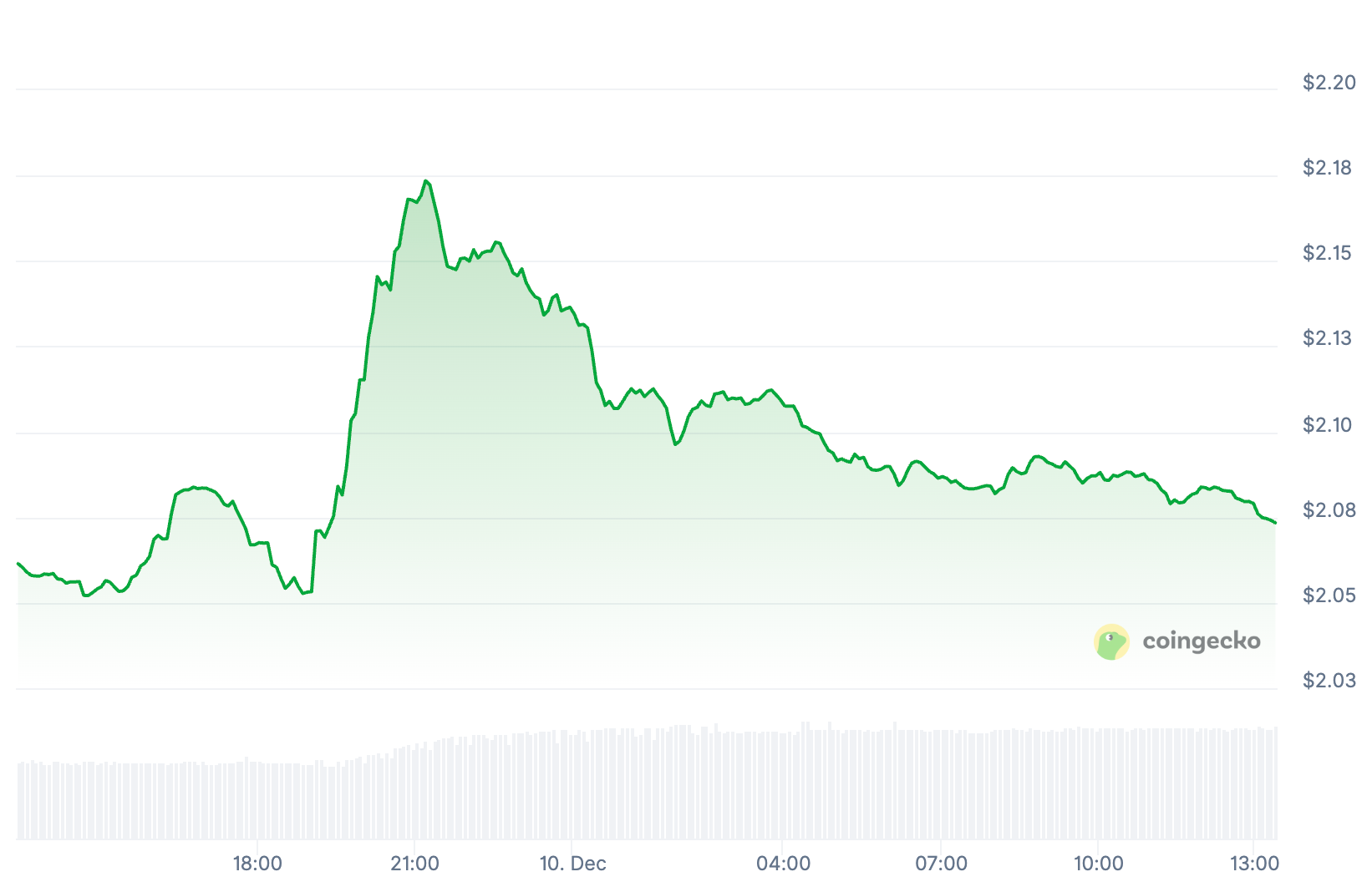 El precio se movió luego nuevamente hacia el rango de 2.09 a 2.10 dólares, una zona que anteriormente ha servido varias veces como soporte. Desde ese nivel no se produjo una recuperación fuerte. Durante el pico anterior, se negoció un volumen superior al 184 por ciento del promedio de 24 horas, mientras que los volúmenes durante intentos de recuperación posteriores fueron notablemente más bajos.
