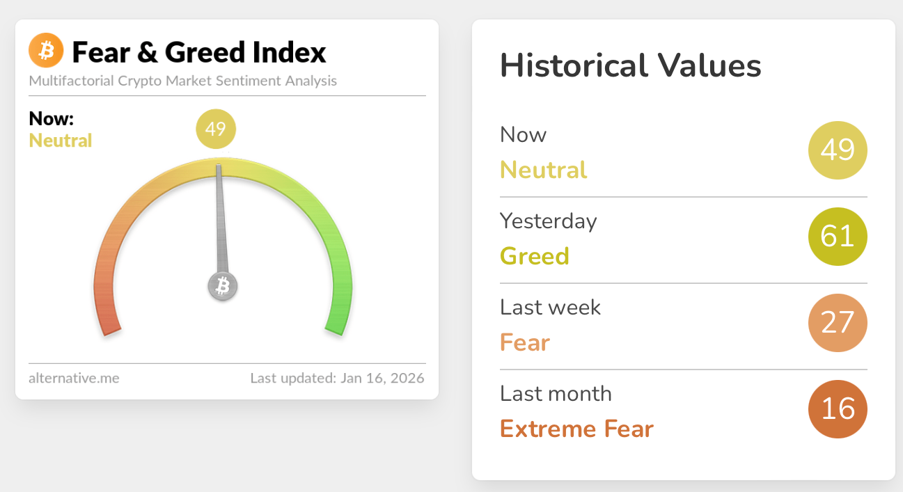 El sentimiento en el mercado de criptomonedas se ha deteriorado nuevamente debido a la incertidumbre política en Estados Unidos. El Índice de Miedo y Avaricia en Cripto cayó el viernes en 12 puntos, situándose en un nivel ‘neutral’ de 49. Un día antes, el índice estaba en 61, lo que indicaba ‘avaricia’ entre los inversores.