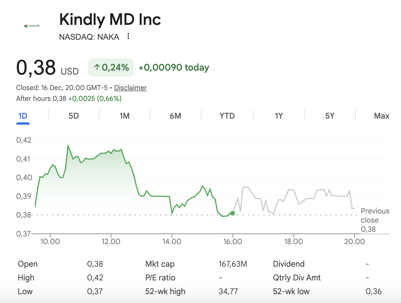 Poco después, las acciones de Kindly MD se dispararon hasta un máximo de 25 dólares el 27 de mayo. Desde entonces, el valor, que cotiza bajo el ticker NAKA, ha caído más de un 98 por ciento.