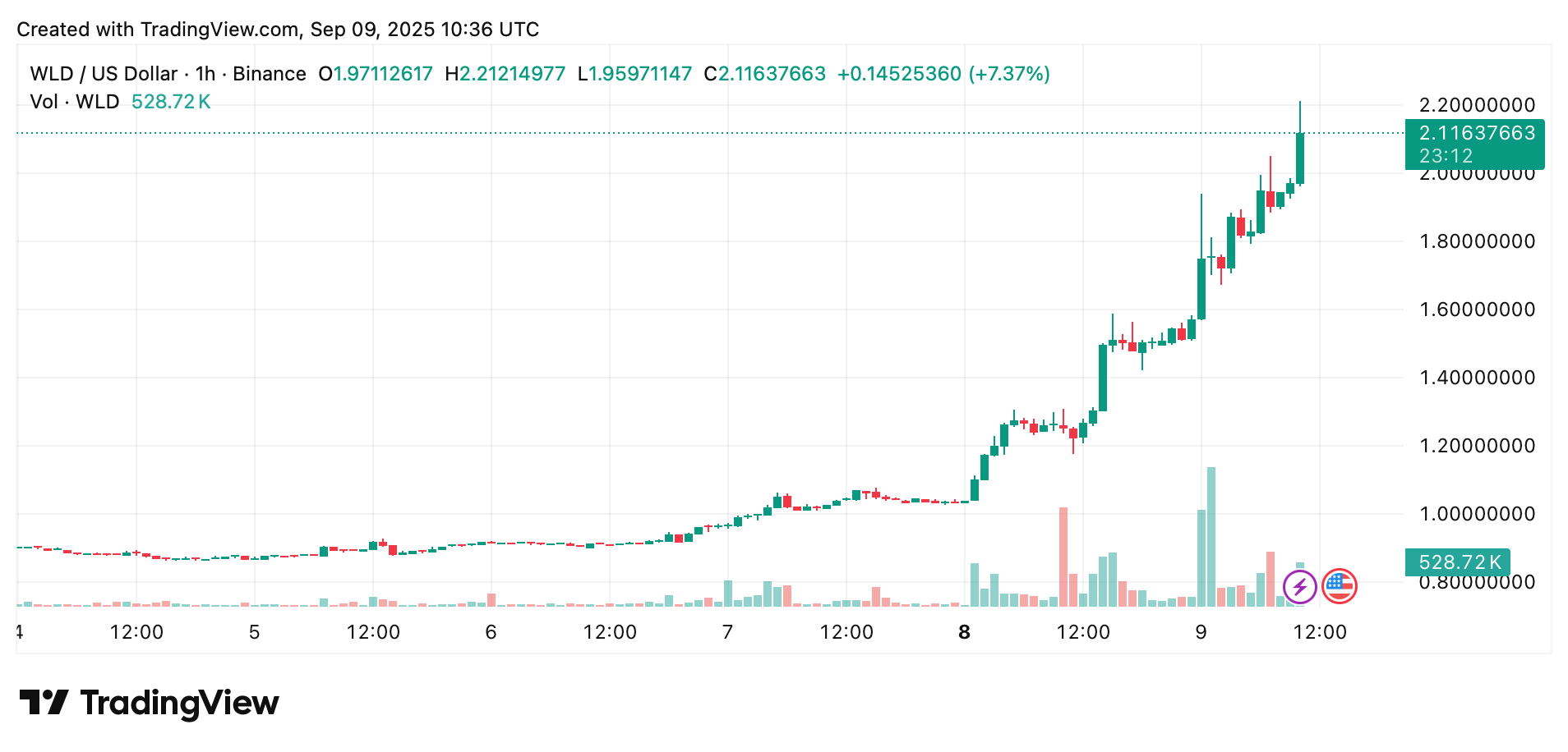 El rendimiento de WLD es impresionante. En los últimos días, el token ha registrado continuas subidas de precio. En la última semana, Worldcoin ha logrado una ganancia del 123,5 por ciento, con un precio actual de 1,96 dólares. Breveente, WLD incluso superó la barrera psicológica de los 2 dólares, pero ese nivel de resistencia parece ser demasiado fuerte por ahora.