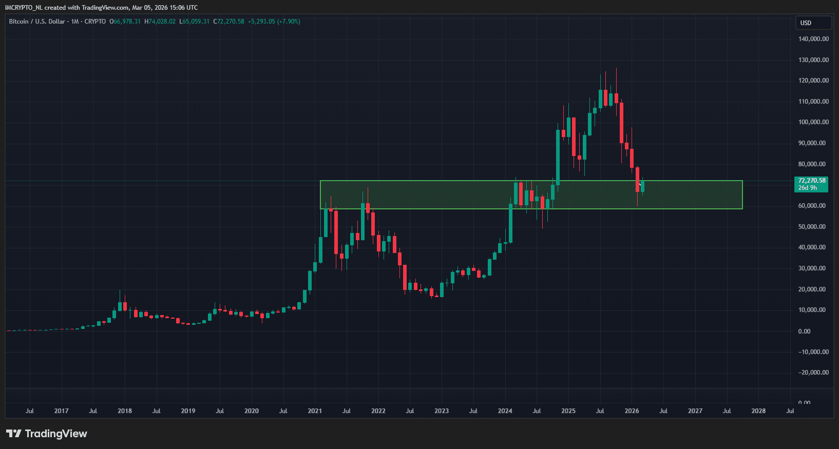 Además, al observar el gráfico mensual, Bitcoin ha alcanzado un punto interesante. En 2021, el precio alcanzó aquí su nivel más alto y en 2024 ha estado fluctuando durante más de ocho meses.