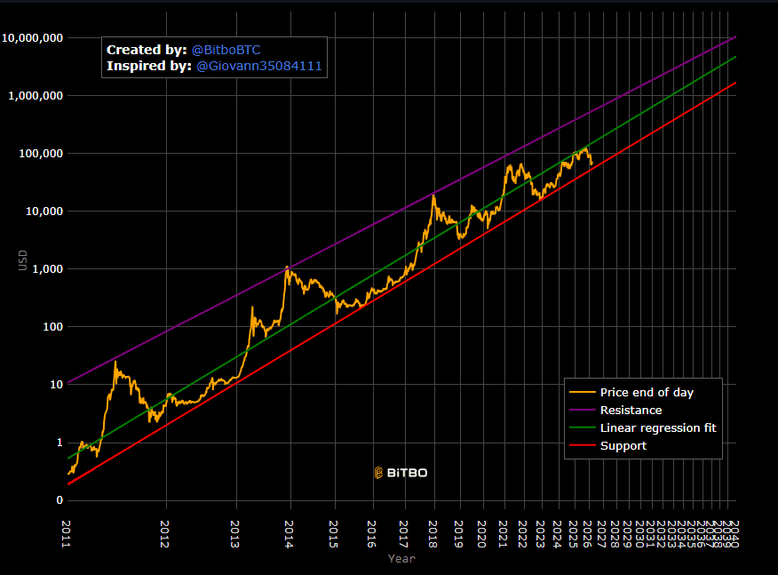 Por ejemplo, el modelo Bitcoin Long Term Power Law describe el crecimiento de Bitcoin a lo largo de múltiples ciclos de mercado y muestra que el precio se encuentra ahora en una zona donde, en mercados bajistas anteriores, se formaron los suelos.