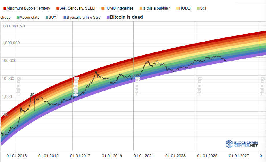 También el conocido Rainbow Chart ofrece una señal similar. En ese modelo, el precio de Bitcoin se divide en diferentes «zonas de valor», desde extremadamente infravalorado hasta severamente sobrevalorado. Actualmente, Bitcoin se encuentra nuevamente en una de las bandas más bajas.