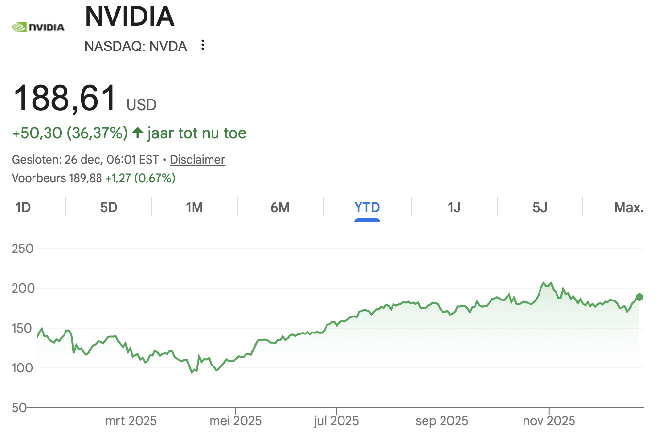 A principios de año, el precio de Nvidia estaba alrededor de 138 dólares. Ahora ha subido a 188,6 dólares. Una inversión de 1.000 dólares el 2 de enero ahora valdría aproximadamente 1.366 dólares. Eso es una ganancia de 366 dólares en solo doce meses.
