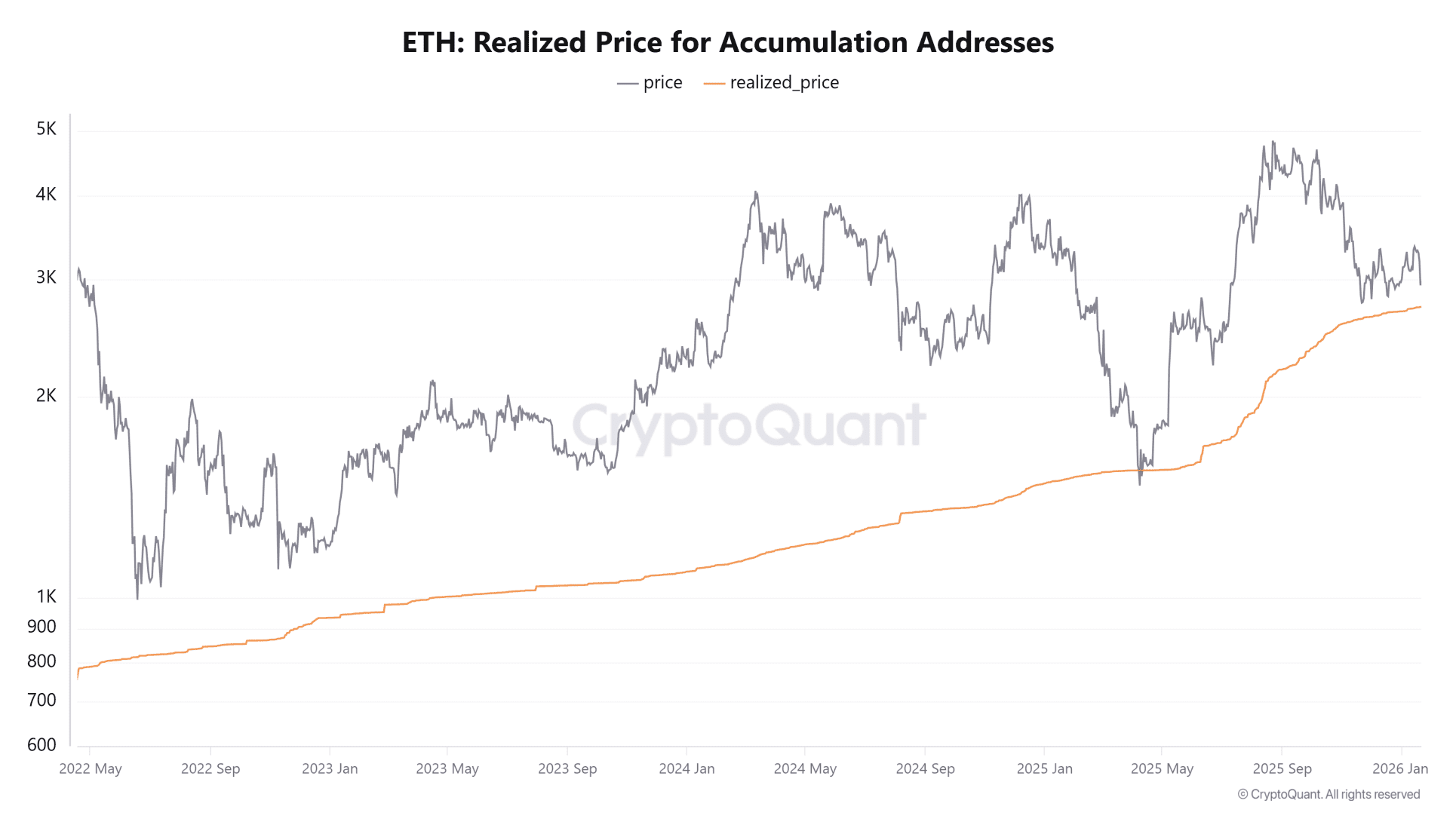 Además de los indicadores macroeconómicos, los datos de blockchain también apuntan a un soporte subyacente. Datos de CryptoQuant muestran que el «nivel de precio realizado» de las direcciones que acumulan Ethereum se sitúa en torno a los 2.700 dólares. Este nivel ha servido en ciclos anteriores como un fuerte soporte para los inversores a largo plazo.