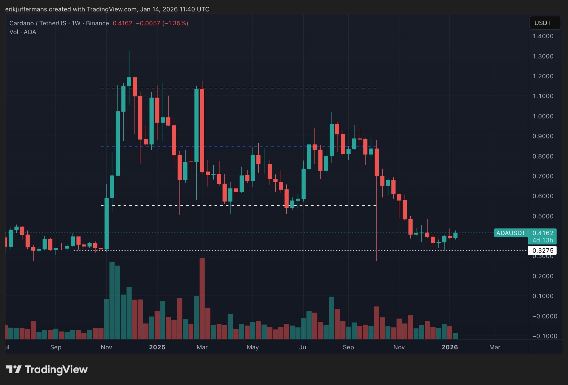 Cardano (ADA) ha pasado por meses difíciles. La cotización cayó aproximadamente un 70% hasta la zona de soporte por encima de los 0,30 dólares, el mismo nivel donde ADA encontró apoyo en el verano de 2024.