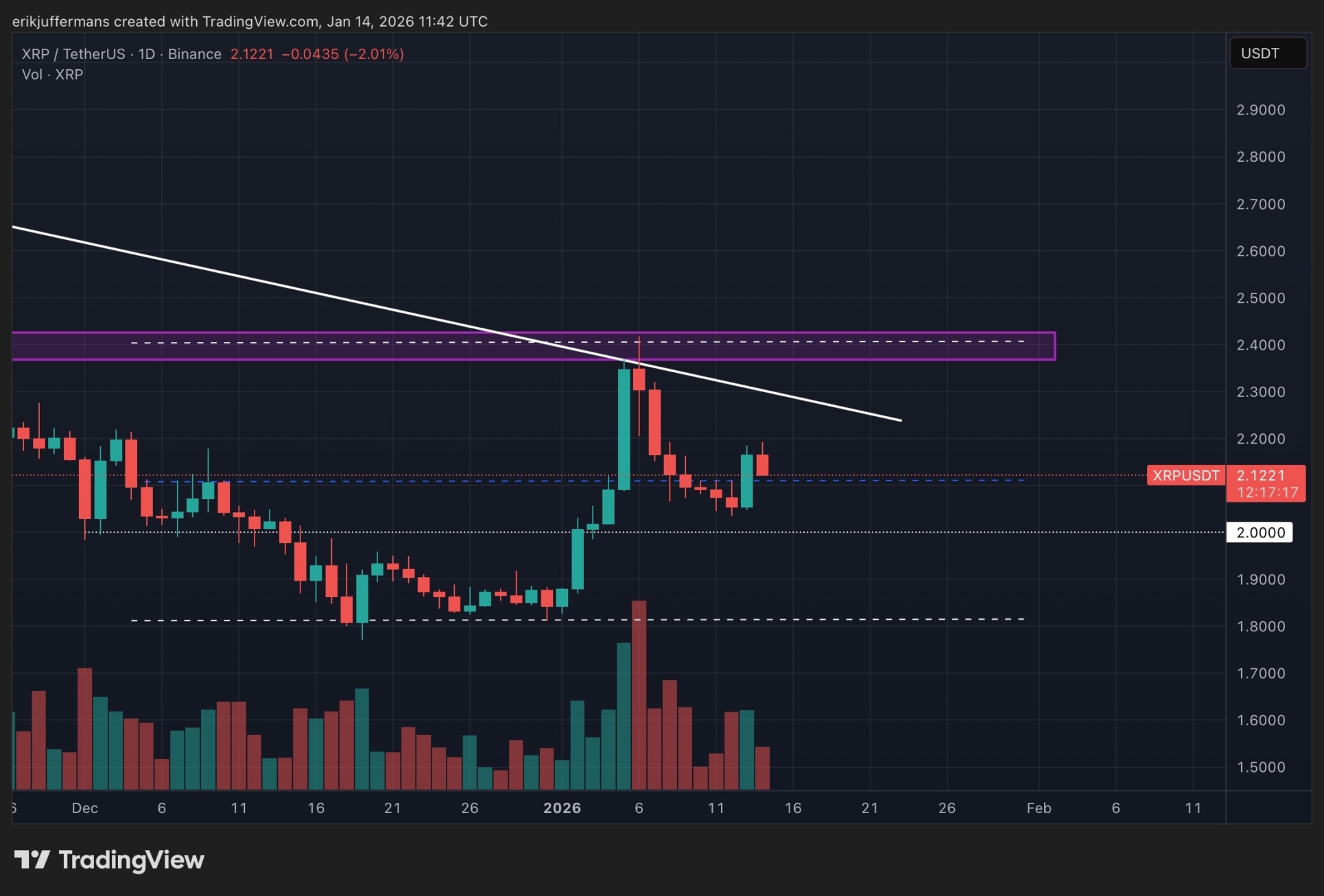 La cotización de Ripple (XRP) encontró apoyo en torno a los 2,05 dólares después de una caída pronunciada desde el reciente pico de 2,40 dólares.