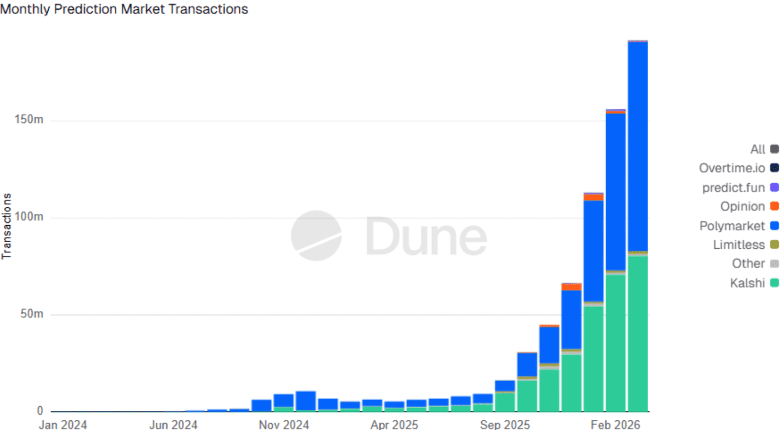 Según datos de Dune, el número de transacciones este mes ya supera los 191 millones, lo que representa un aumento del 2.838 por ciento respecto al mismo periodo del año pasado. Además, el volumen de comercio también se incrementó significativamente, situándose ahora en aproximadamente 23.900 millones de dólares, frente a los 1.900 millones de dólares de hace un año.