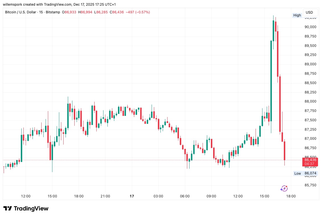 Bitcoin (BTC) experimentó un movimiento vertiginoso el miércoles: su precio superó brevemente los 90,000 dólares, para luego caer rápidamente hacia los 86,000 dólares. En cuestión de minutos, se liquidaron más de 120 millones de dólares en posiciones cortas. ¿Qué hay detrás de este intenso fenómeno de pump-and-dump y qué dice esto sobre el sentimiento en el mercado de criptomonedas?