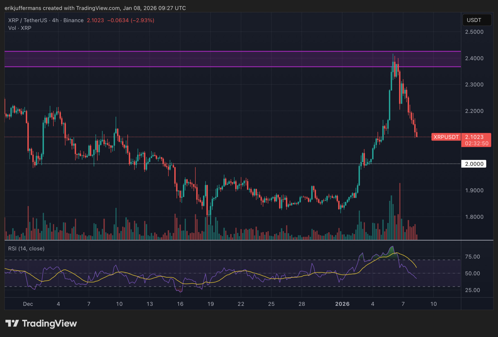 Ripple (XRP) es considerablemente más emocionante en este momento. El martes, tras un fuerte aumento, el precio alcanzó el nivel de 2.40 dólares. El RSI estaba entonces muy alto y ya mencionábamos que una corrección era muy probable. En ese momento, señalamos el nivel de 2.20 dólares como primer objetivo. Este nivel fue fácilmente superado y actualmente XRP se cotiza a 2.10 dólares.