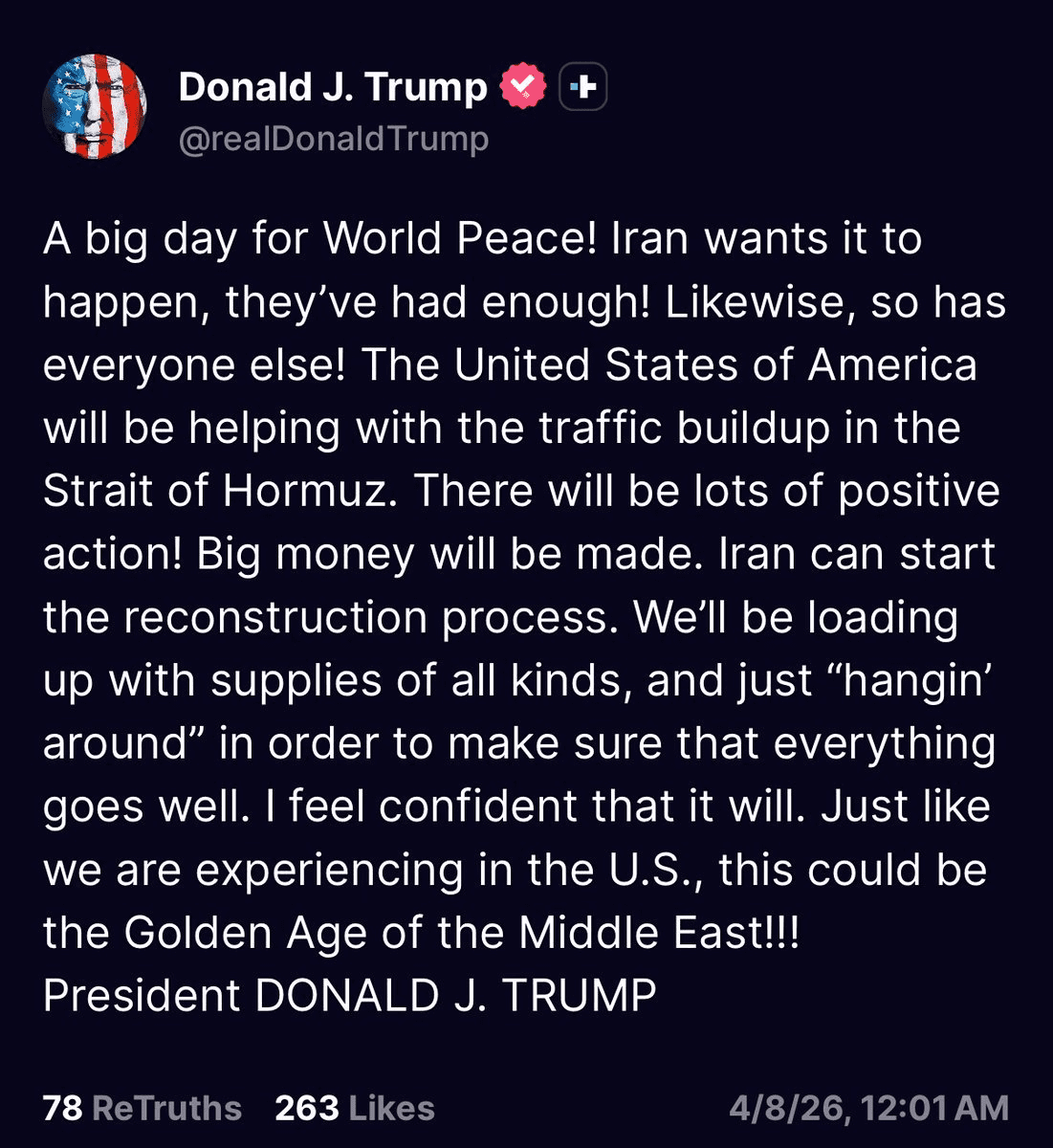 Trump adoptó un tono sorprendentemente optimista. Escribió que Irán puede comenzar con la reconstrucción y llamó al alto el fuego una oportunidad para lo que describió como la Edad de Oro de Oriente Medio.
