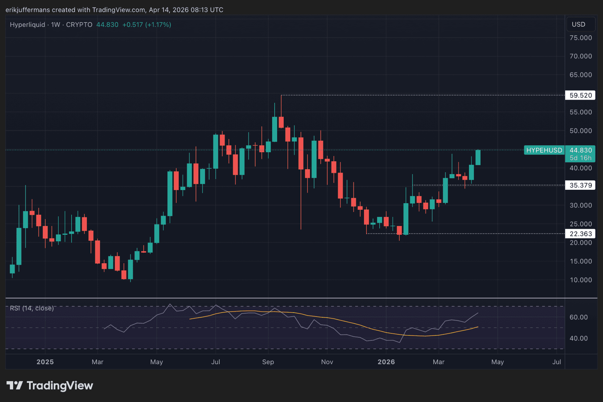 HYPE ha recuperado completamente su impulso. Y con la recuperación del mercado en general, HYPE tiene aún más espacio para subir. Parece solo cuestión de tiempo antes de que el valor pruebe su máximo histórico de casi 60 dólares.