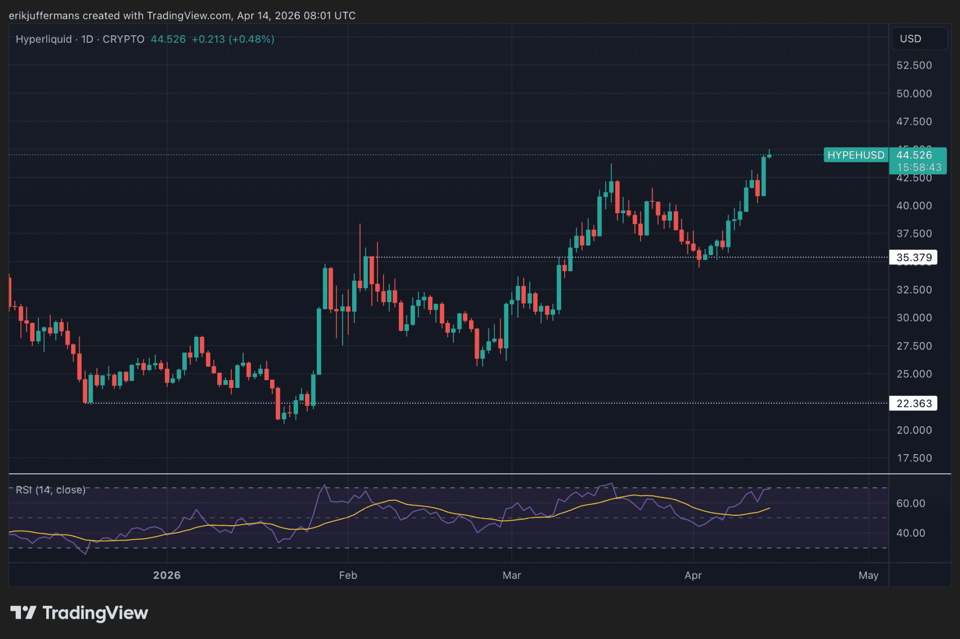 En los últimos meses, el mercado de criptomonedas ha mostrado cierta indecisión. Pero este no es el caso de HYPE. Desde enero, el valor del token ha mantenido una clara tendencia alcista, subiendo de un mínimo de aproximadamente 20 dólares a su valor actual de 45 dólares, el nivel más alto desde octubre.