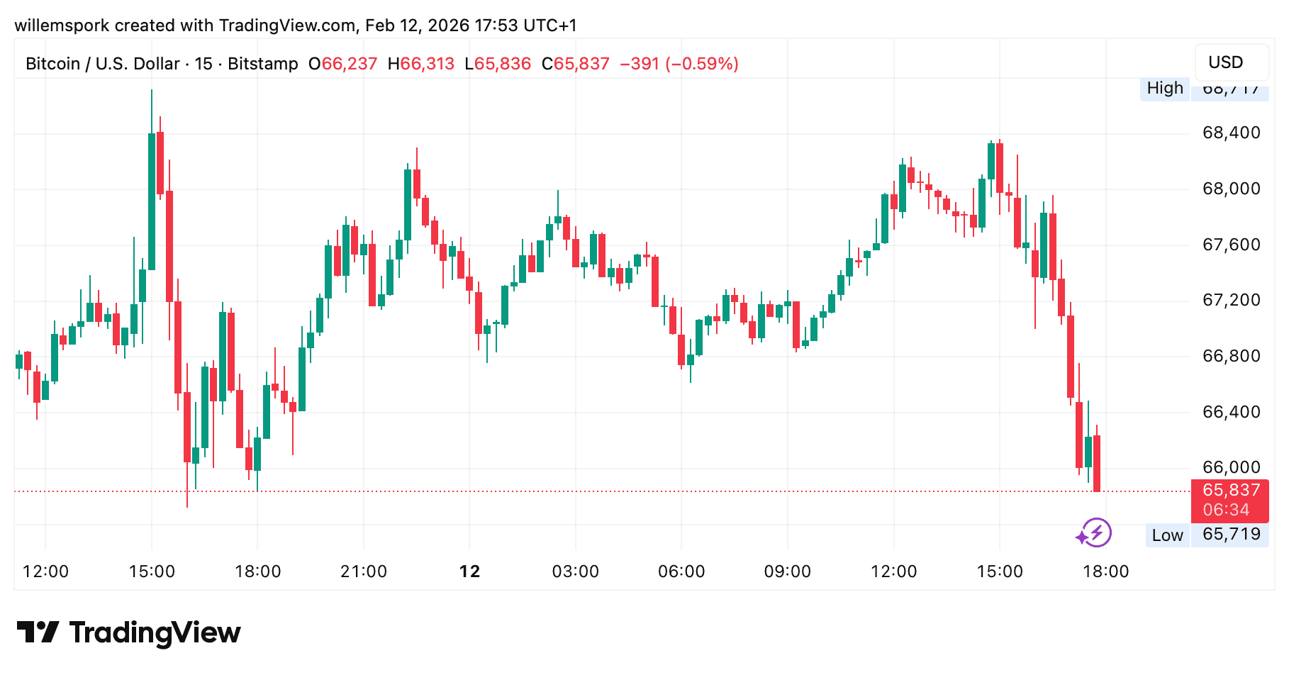El precio de Bitcoin tambiĆ©n sufrió un descenso cuando la ola de ventas en Wall Street se intensificó. En el grĆ”fico se observa que BTC bajó brevemente por debajo de los 66.000 dólares antes de recuperarse ligeramente. Estos movimientos son caracterĆsticos de un mercado en tensión: se retira el riesgo cuando las acciones caen, y se reintroduce cuando hay un respiro.