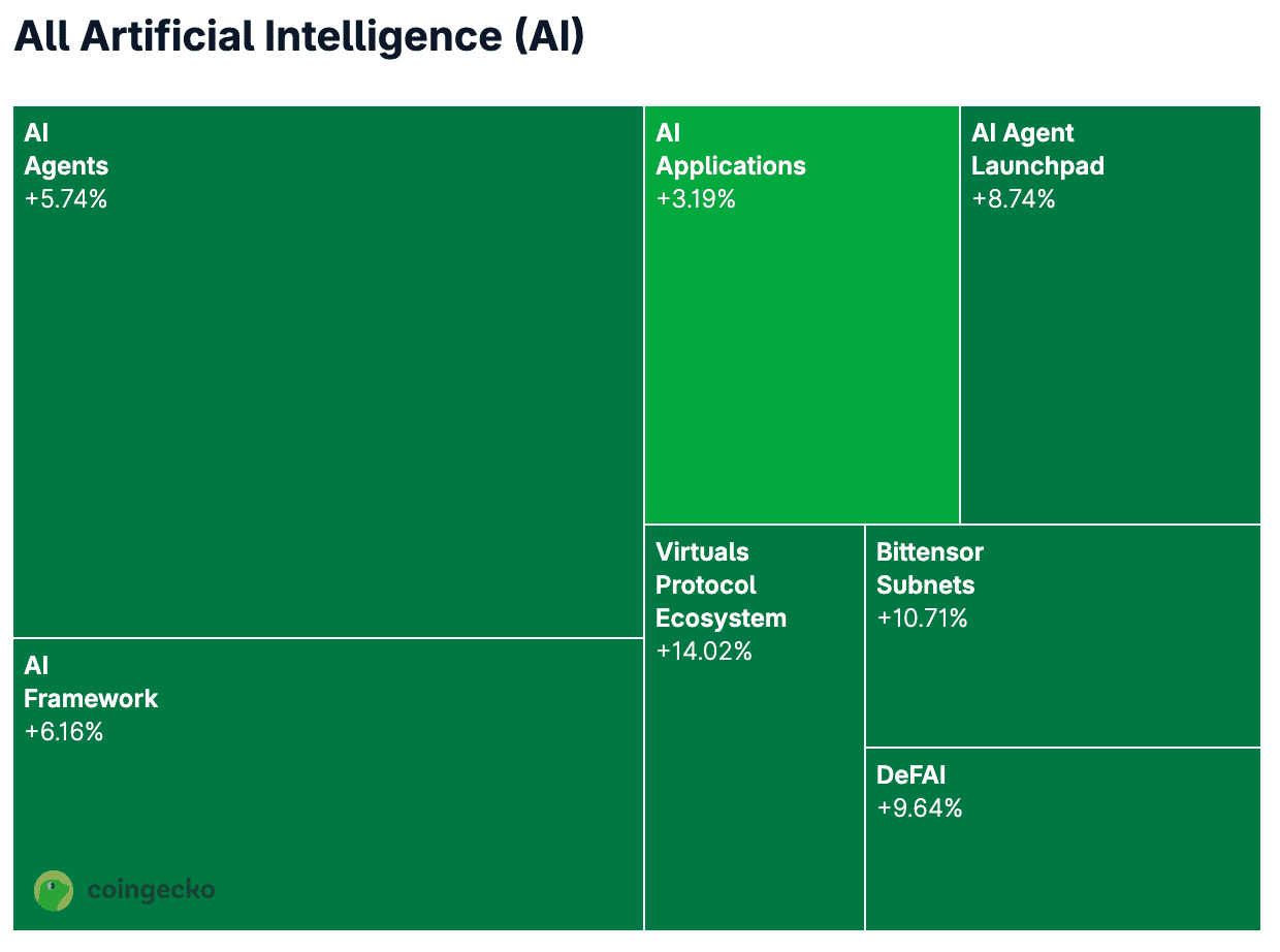 EspecÃficamente, el grupo de monedas de agentes de IA mostró un aumento del 5,7 por ciento en 24 horas. Las plataformas enfocadas en el lanzamiento de agentes de IA, conocidas como lanzaderas de agentes de IA, tuvieron un desempeño aún mejor, con un incremento del 8,74 por ciento.