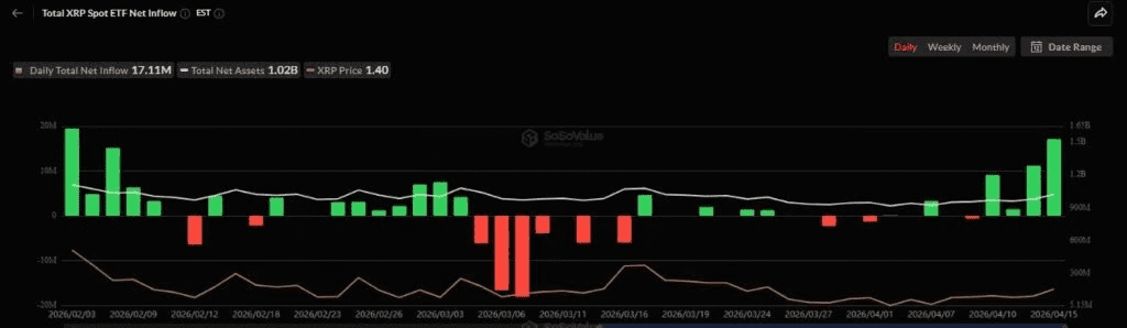 Los ETF de XRP al contado registraron el 15 de abril la mayor entrada diaria en casi once semanas. Según datos de SoSoValue, se ingresaron netamente 17,11 millones de dólares en los fondos, el nivel más alto desde el 3 de febrero.