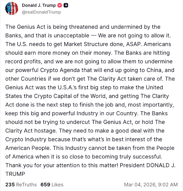 El presidente Donald Trump intervino notablemente en el debate esta semana, acusando a los bancos de sabotear la ley. Según él, están socavando deliberadamente el progreso de la regulación criptográfica.