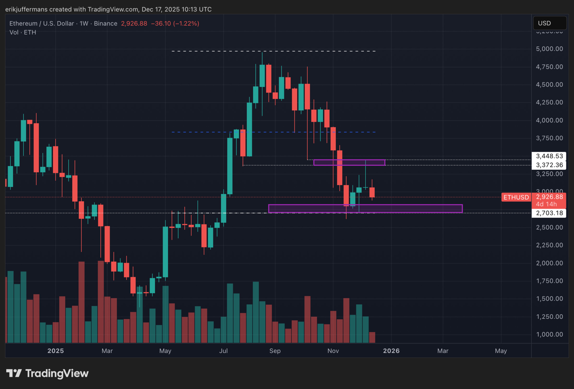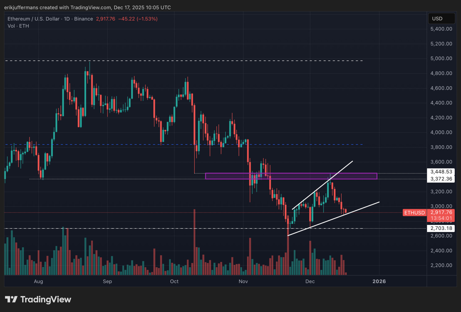 Mientras los metales preciosos y los mercados bursátiles coquetean con máximos históricos, el mercado cripto enfrenta dificultades. Este es también el caso de Ethereum (ETH). La estrella del mercado de altcoins se cotiza actualmente alrededor de los 2.900 dólares, más de un 50 por ciento por debajo del máximo histórico alcanzado a principios de este año. El analista técnico Erik Juffermans de Newsbit investiga si hay espacio para una recuperación.