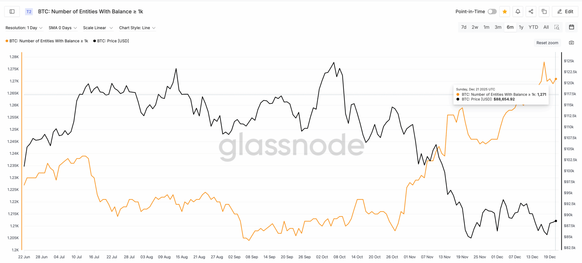 No solo los pequeños inversores parecen estar más activos. También el número de direcciones que poseen al menos 1.000 Bitcoins, a menudo vistas como grandes jugadores o ‘ballenas’, está volviendo a aumentar levemente. Ese número había disminuido notablemente a principios de mes, pero alrededor del 20 de diciembre comenzó a subir cautelosamente.