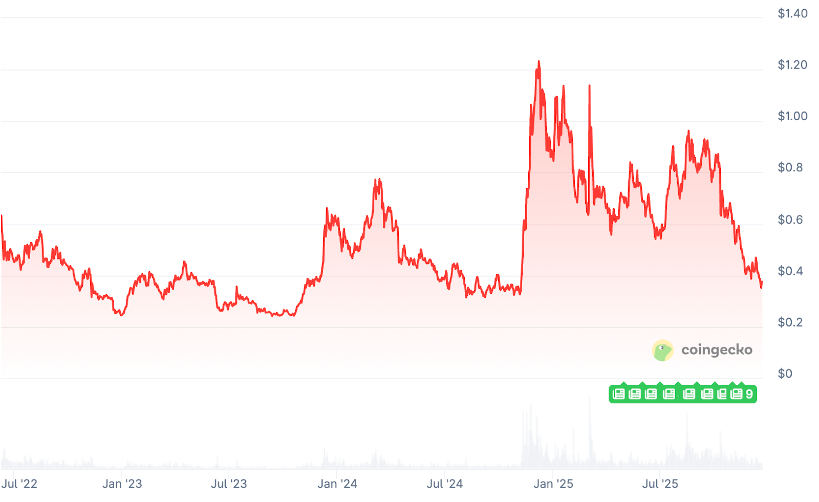 A pesar del fuerte aumento de Midnight, Cardano sigue rezagado. El precio de ADA cayó un 1,6 por ciento en las últimas 24 horas, alcanzando 0,37 dólares. Esto se acerca al nivel de finales de 2022, justo después de la caída de FTX.