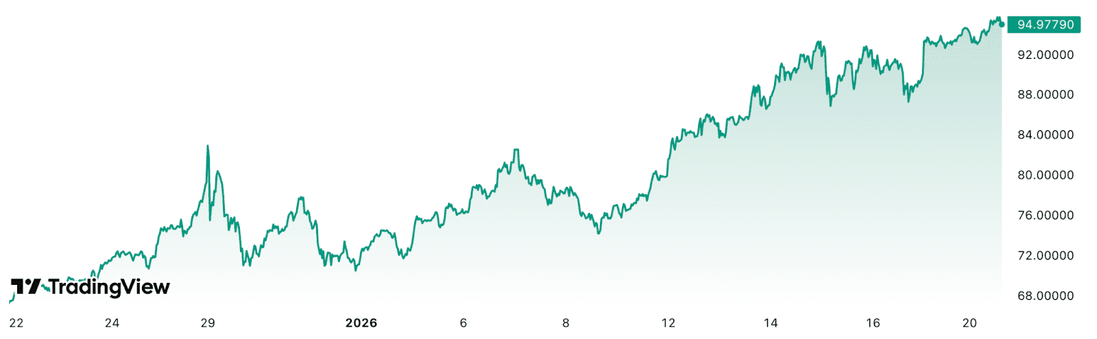 Para Schiff, el fuerte incremento de la plata es un preludio de un colapso en el precio de Bitcoin. El metal precioso alcanzó el lunes un máximo histórico de 95,88 dólares por onza. Actualmente, el precio ronda los 95,20 dólares.