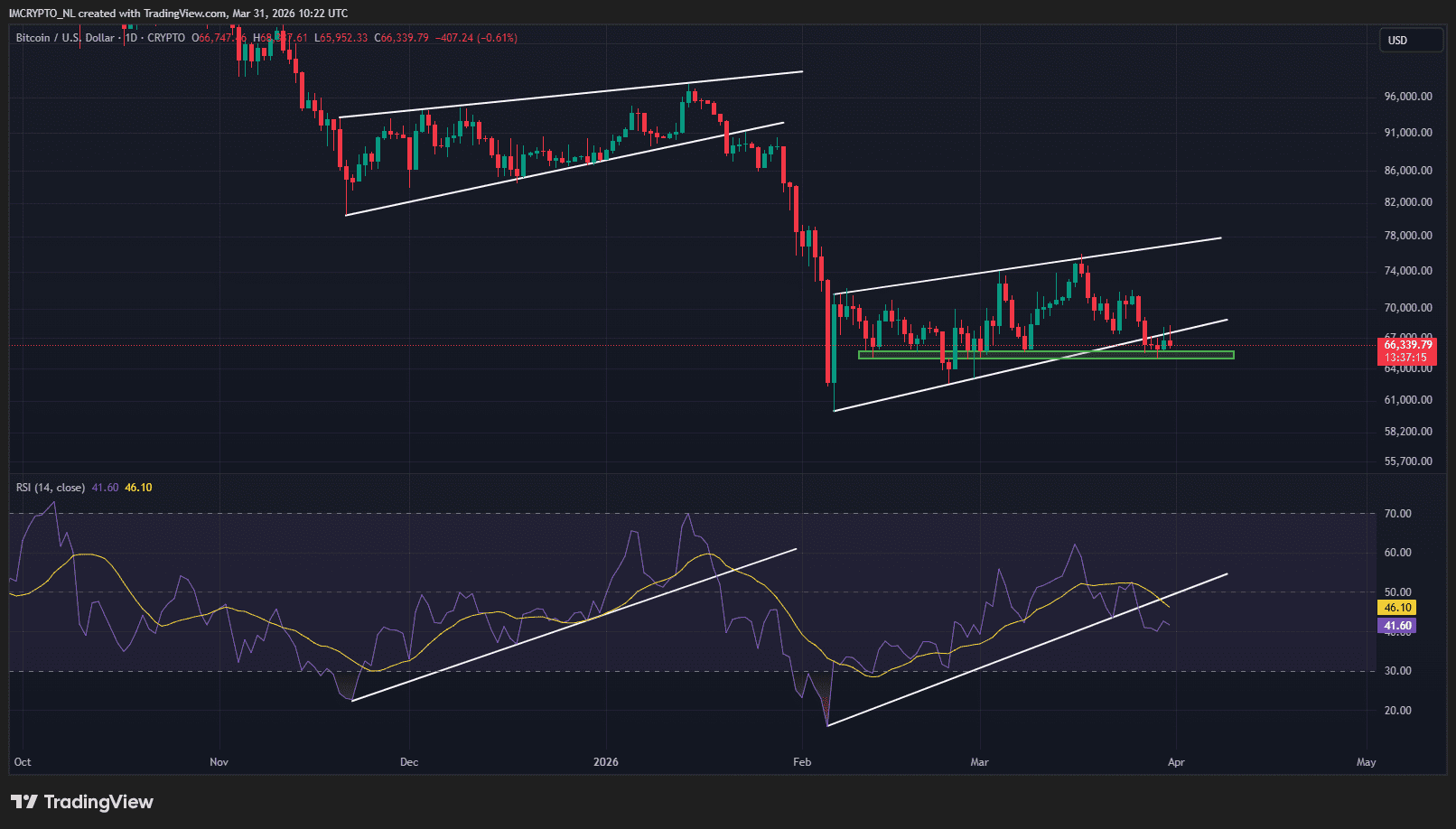 Aún queda una esperanza. Mientras el precio se mantenga por encima de la zona de soporte verde, entre aproximadamente 65.000 y 66.000 dólares, no se descarta un regreso al bearflag. Sin embargo, esta es la última línea de defensa. Si se rompe, el camino hacia los 60.000 dólares, o incluso menos, estará despejado.